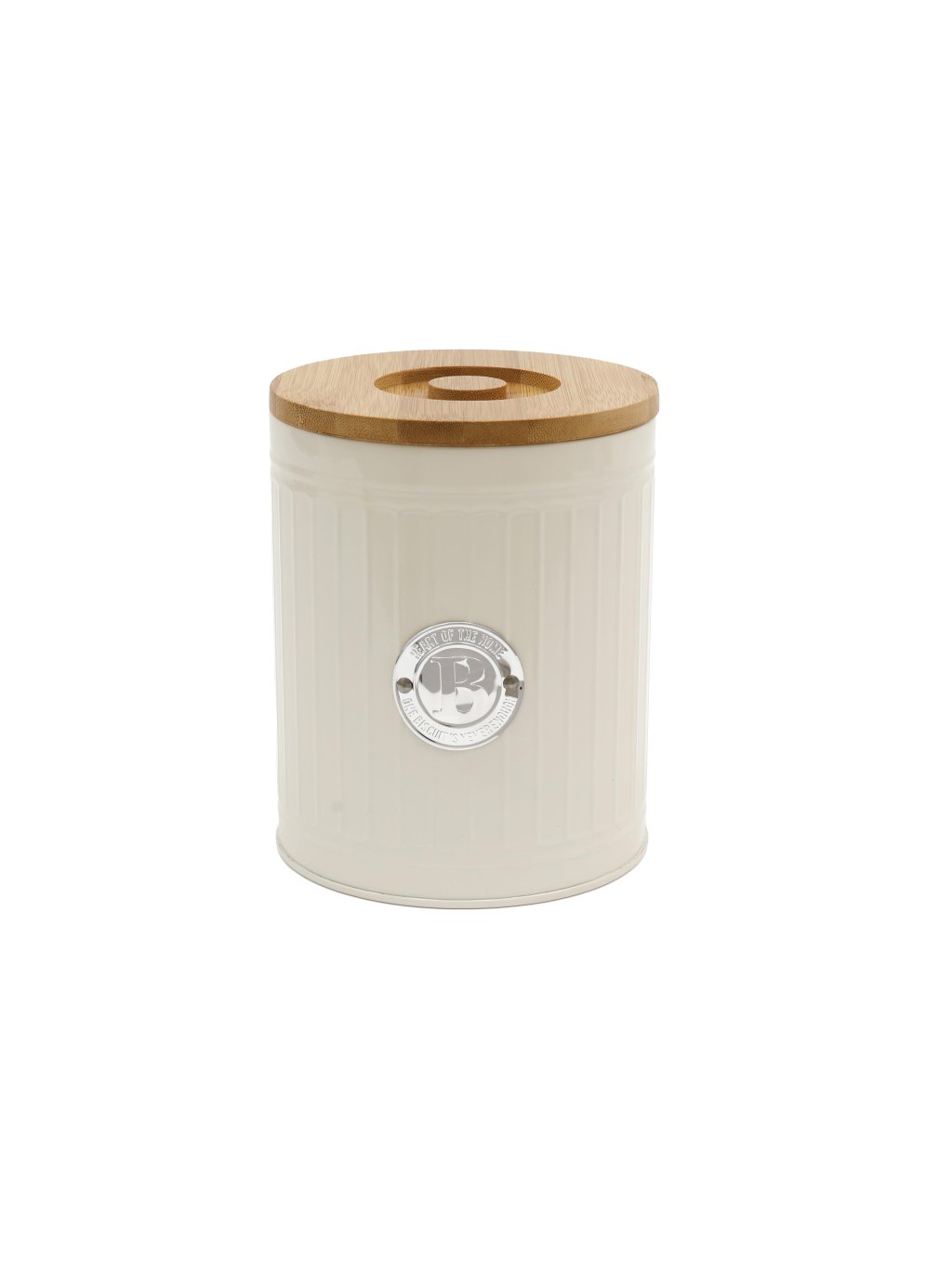Štýlová retro dóza v krémovej farbe s jemnými vertikálnymi drážkami a bambusovým vekom je dokonalým spojením elegancie a praktickosti. Kovové telo s decentným leskom dopĺňa kovový emblém „B“, ktorý jej dodáva autentický vintage vzhľad.