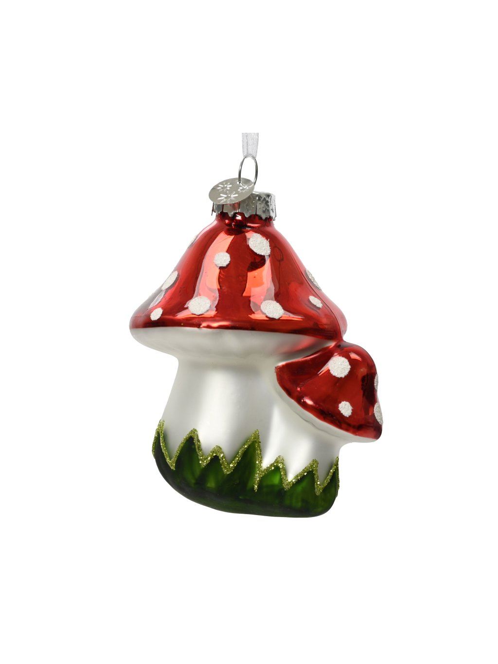 🍄 Jemná ručná práca zo skla prináša dokonalé detaily – od zeleného trávnatého podstavca s ligotavými glitrami až po decentný hliníkový klobúčik s bielou organzovou stuhou na zavesenie. Vďaka svojmu menšiemu rozmeru (7,5 cm) krásne zapadne medzi ostatné ozdoby, no zároveň si zachová svoju jedinečnosť. Sklenená muchotrávka pôsobí nielen dekoratívne, ale aj hravo, čo robí váš stromček osobitejším.