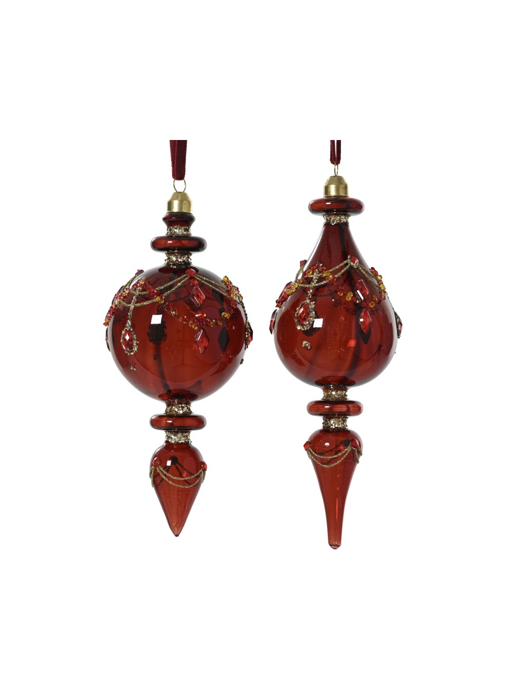 💎 Sada dvoch závesných ozdôb v odtieni oxblood červenej kombinuje tradičnú farbu Vianoc s luxusným prevedením. Sklo s transparentným leskom dopĺňajú trblietky, korálky a diamantovo pôsobiace detaily, ktoré sa krásne ligocú v odraze svetielok. Každý kúsok má výšku 18cm a priemer 8cm, takže pôsobí honosne, no stále elegantne.