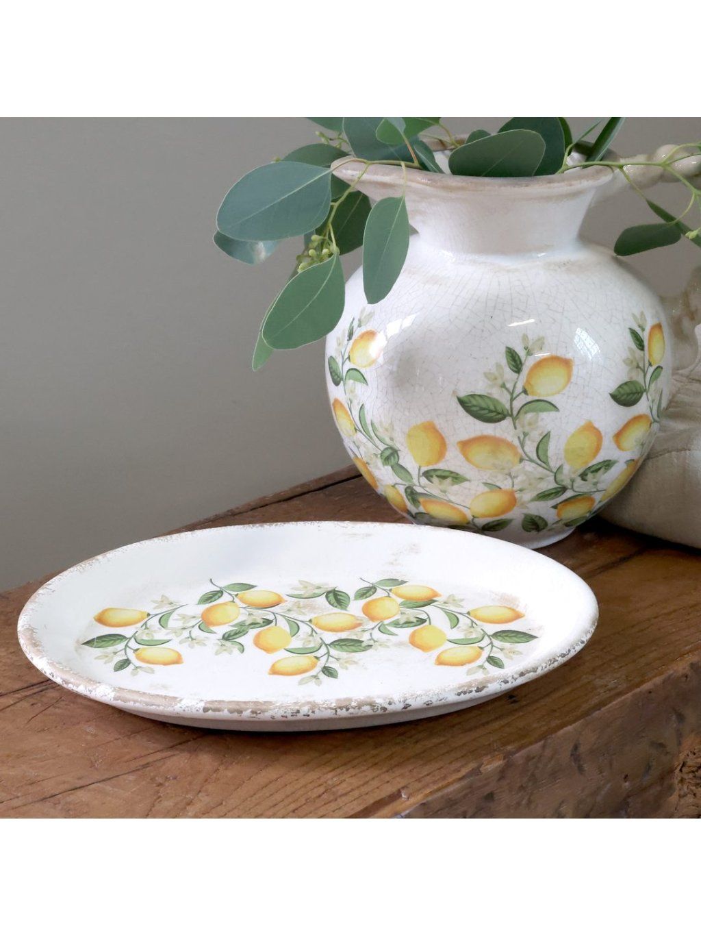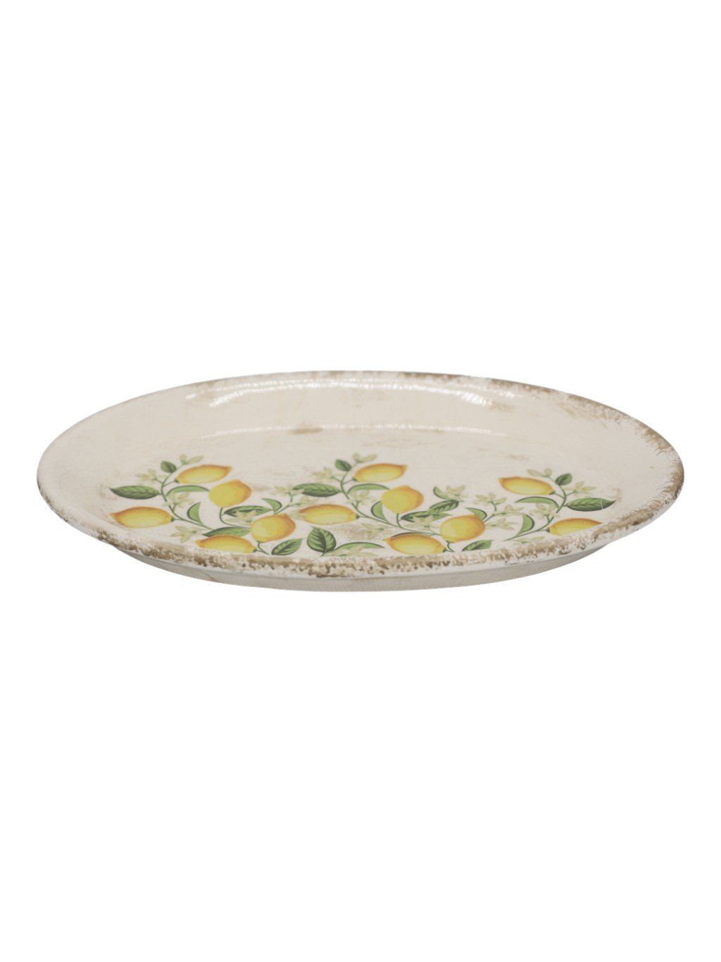 Podnos z keramiky (pottery) zaujme jednoduchým tvarom a decentným motívom citrónov s listami, ktorý pôsobí prirodzene a nadčasovo. Krémový podklad s mierne patinovaným okrajom dodáva podnosu rustikálny charakter, vďaka čomu sa hodí do tradične aj moderne ladených priestorov.