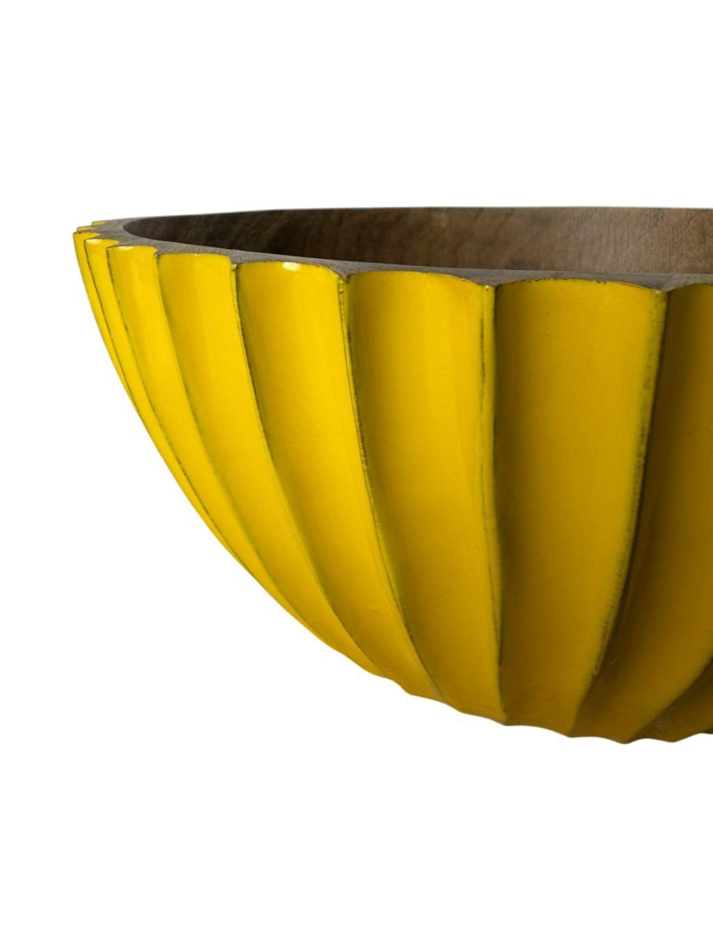 Miska zaujme svojím reliéfnym vonkajším povrchom v žltej farbe, ktorý vytvára zaujímavú hru svetla a tieňa. Vnútro si zachováva prirodzený vzhľad dreva, čím pôsobí hrejivo a autenticky. Je vhodná na styk s potravinami, takže ju môžete využiť na ovocie, drobné pochutiny či servírovanie. Vynikne na jedálenskom stole, kuchynskej linke aj ako dekorácia v obývačke. Svojím tvarom a farbou dodá priestoru energiu a zároveň si zachová nadčasový charakter.