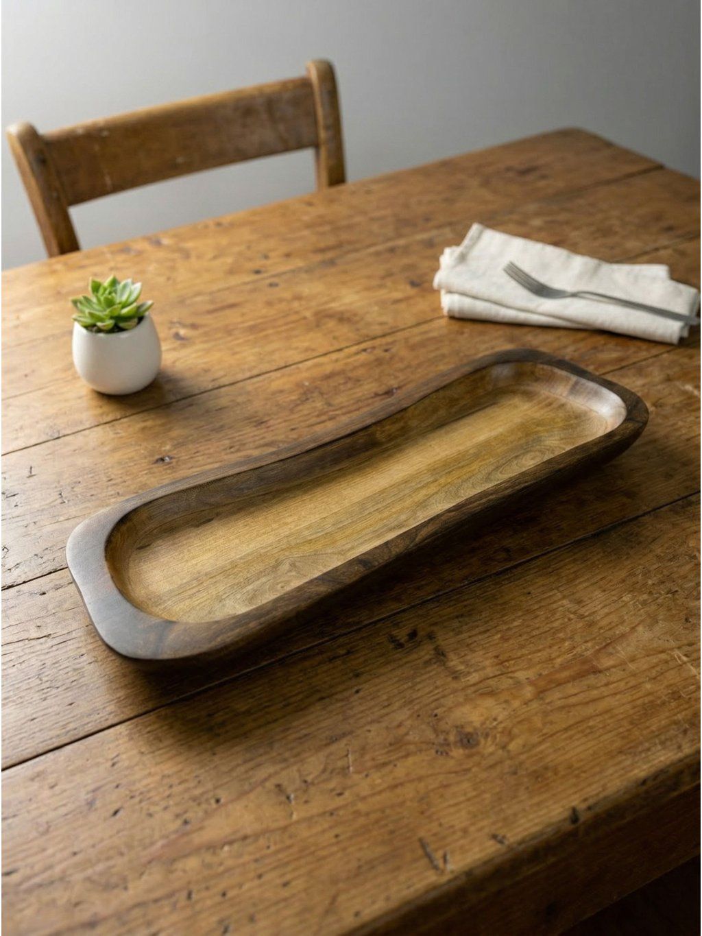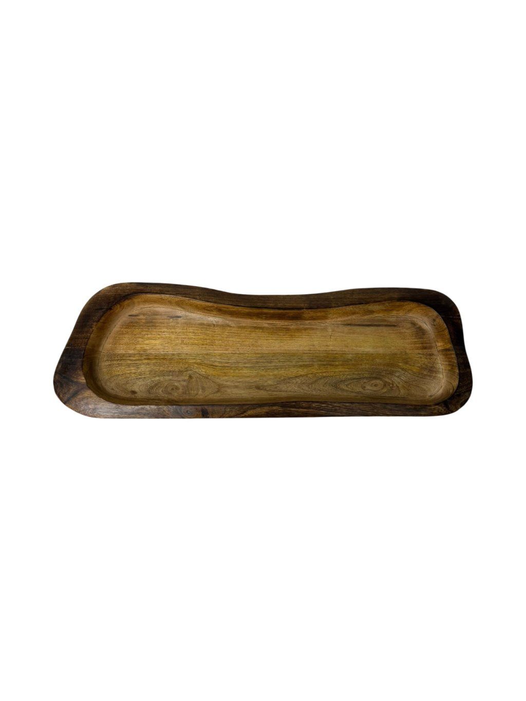 Táto miska je vyrobená z masívneho dreva s výraznou štruktúrou, ktorá pôsobí teplo a autenticky. Jej predĺžený, jemne zvlnený tvar pôsobí moderne a zároveň prirodzene zapadne do rôznych štýlov interiéru. Vďaka svojej veľkosti je ideálna na servírovanie pečiva, ovocia, drobných pochutín alebo ako dekoratívny prvok na stole či komode. Je vhodná na styk s potravinami, takže spája estetiku s praktickým využitím v každodennom živote.
