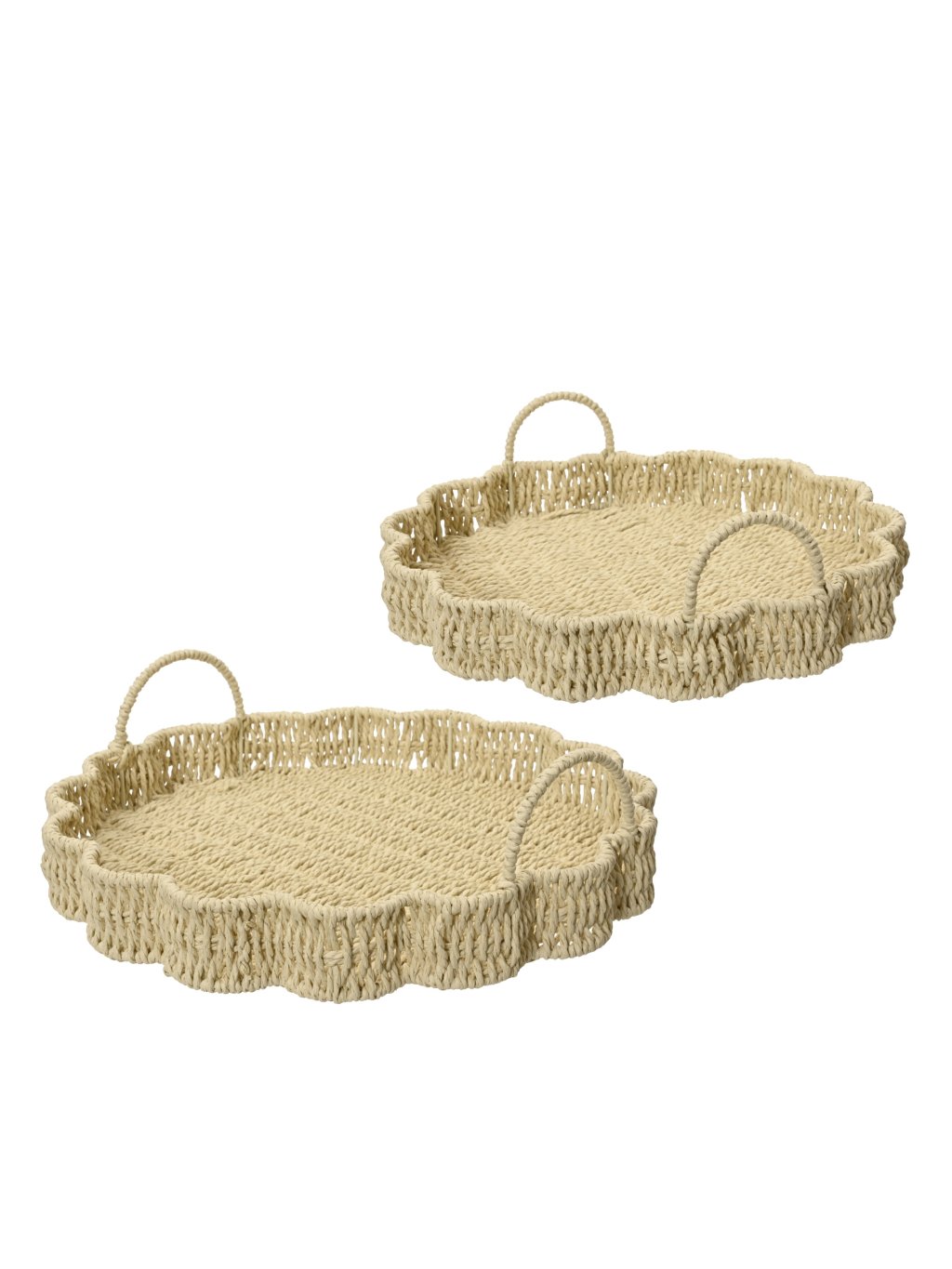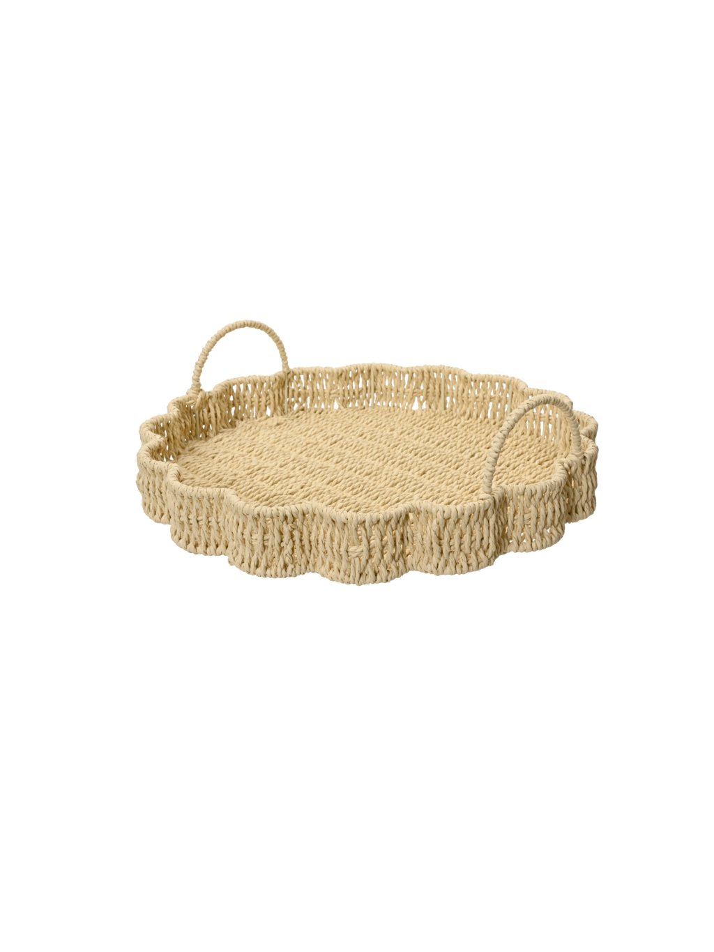 Na prvý pohľad zaujme mäkkou, zvlnenou líniou, ktorá pripomína okvetné lístky. Je vypletaný z papierového povrazu, vďaka čomu je ľahký, ale stabilný. Rúčky nie sú len praktickým detailom – dotvárajú celkový vzhľad a robia z podnosu harmonický celok.