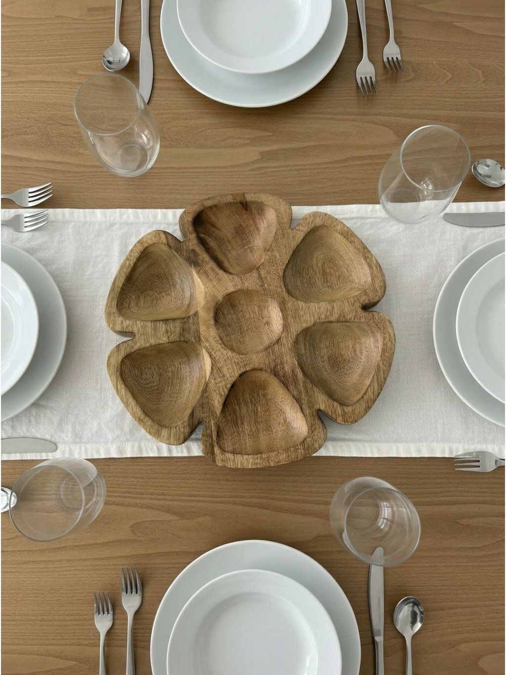 Podnos je vyrobený z masívneho dreva s krásnou kresbou, ktorá dodáva každému kusu jedinečný charakter. Jeho tvar štvorlístka ponúka viacero oddelených priehlbín, vďaka čomu je ideálny na servírovanie rôznych druhov pochutín naraz – od orechov a ovocia až po drobné snacky. Jemne zaoblené línie pôsobia prirodzene a príjemne na dotyk. Vynikne pri každodennom stolovaní aj pri slávnostných príležitostiach, kde sa stane nielen praktickým, ale aj dekoratívnym prvkom.