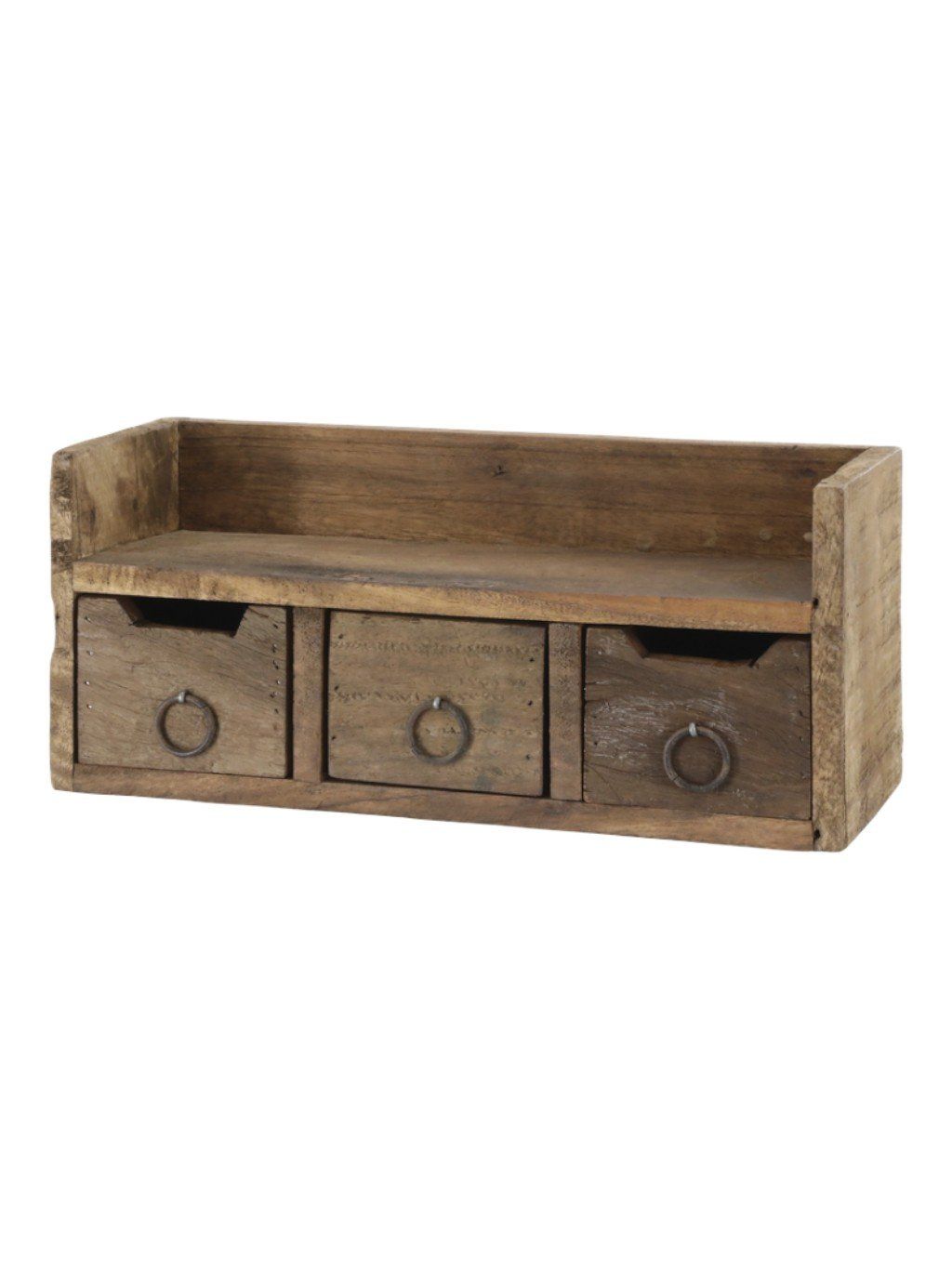 Kompaktná nástenná polička z recyklovaného dreva s tromi zásuvkami pre praktické uskladnenie drobností. Každý kus má jedinečný vzhľad s prirodzenou patinou.