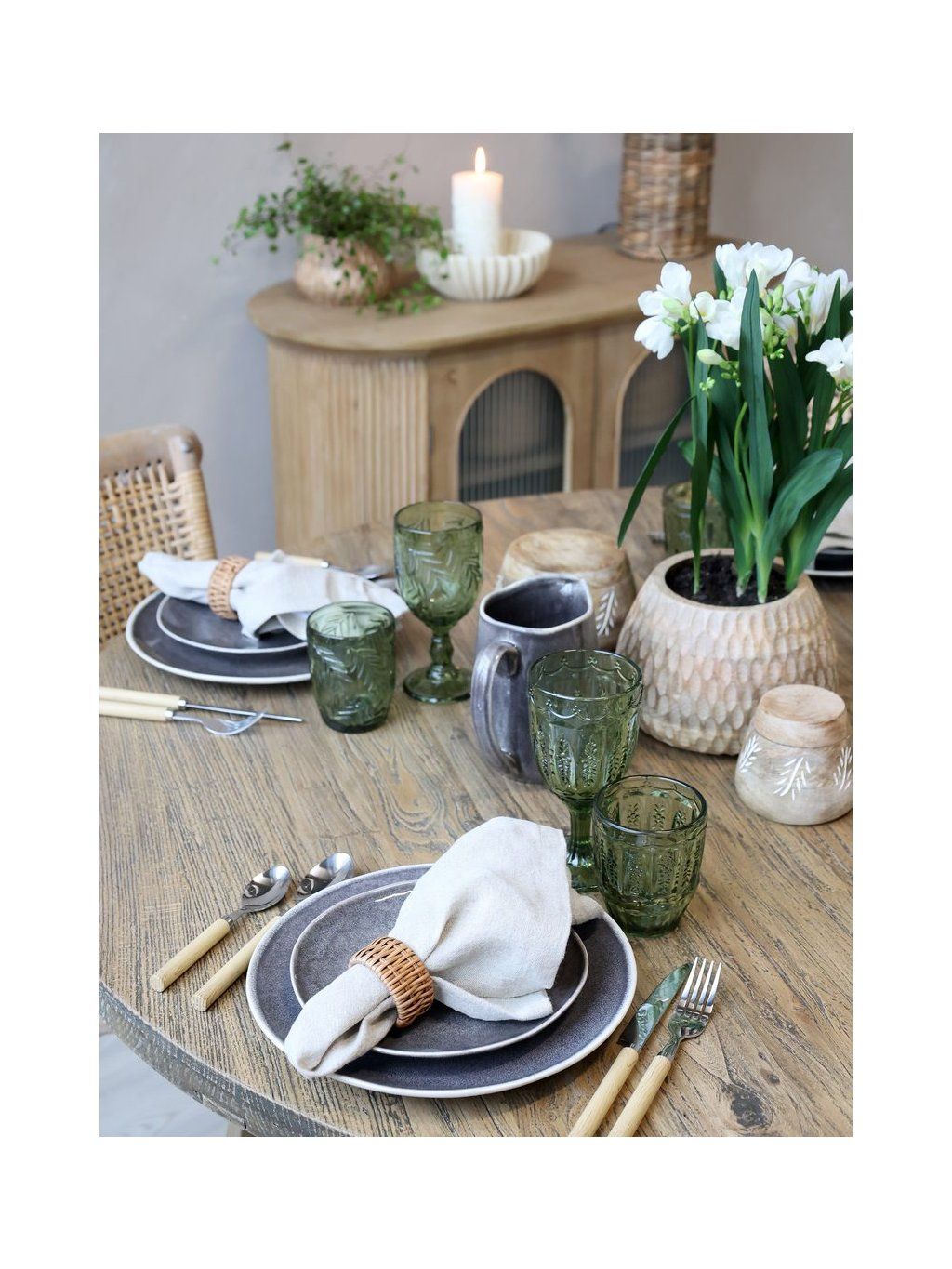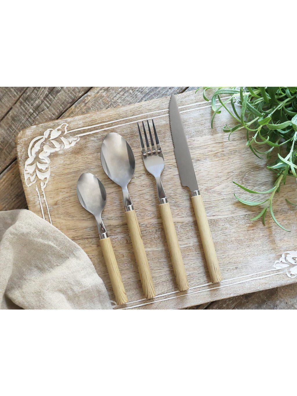 Sada príborov pre 4 osoby s jednoduchým dizajnom a rukoväťami v prírodnom vzhľade. Vhodná na každodenné stolovanie.