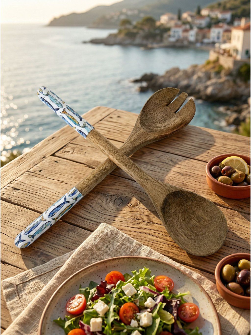 Set pozostáva z lyžice a vidličky z masívneho dreva, ktoré sú doplnené o rukoväte s dekorom sardiniek v jemných modrých tónoch. Táto kombinácia dodáva príboru originálny vzhľad a zároveň si zachováva prirodzený charakter. Vďaka svojmu tvaru a veľkosti je ideálny na servírovanie šalátov, zeleniny či cestovín. Je vhodný na styk s potravinami, takže ho využijete pri každodennom stolovaní aj pri letných posedeniach. Skvele zapadne do kuchyne s prírodným alebo námorníckym štýlom.