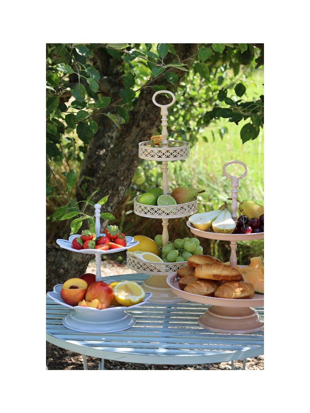 Etažér je vyrobený z kovu a vďaka stabilnej konštrukcii poskytuje spoľahlivý priestor na servírovanie ovocia, dezertov či drobného občerstvenia. Dve poschodia ponúkajú dostatok miesta a zároveň šetria priestor na stole, čo oceníte pri rodinných stretnutiach aj slávnostnom stolovaní.