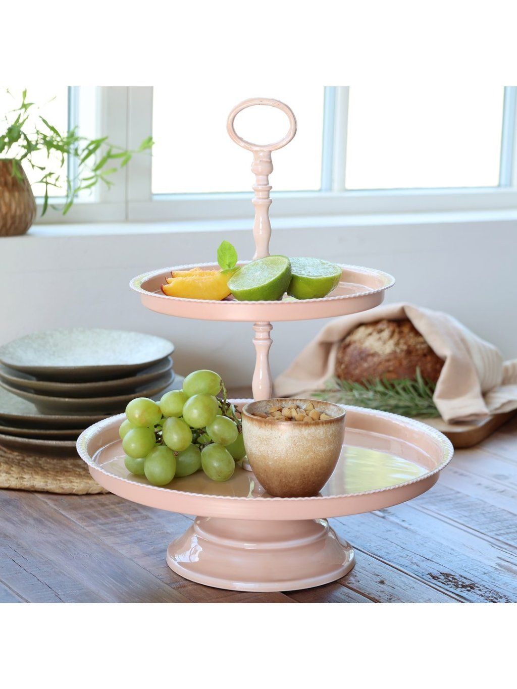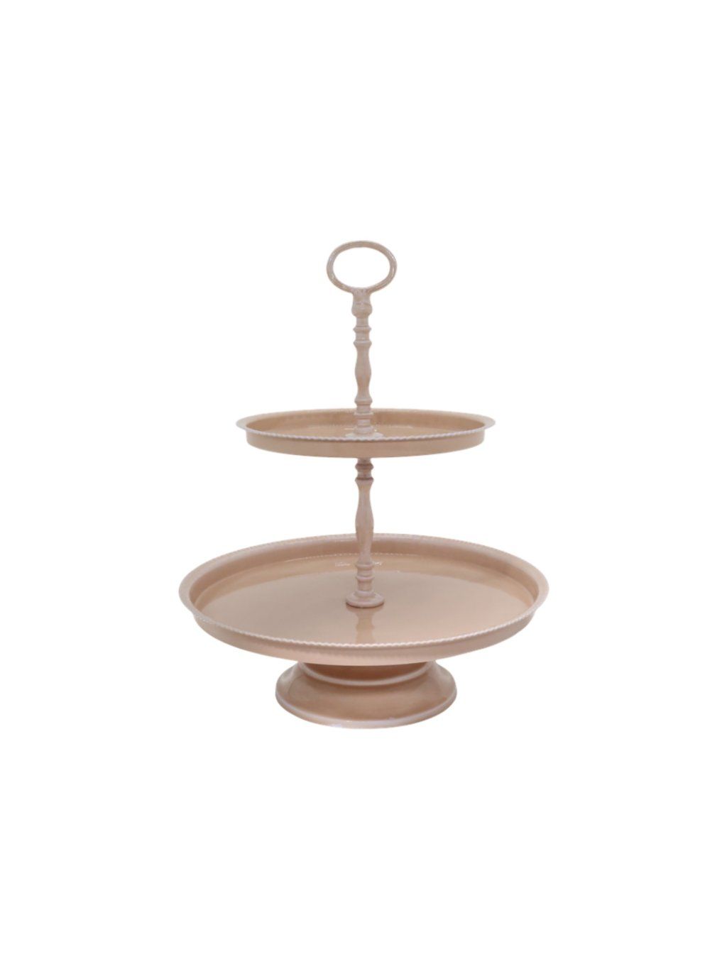Dvojposchodový etažér z kovu v jemnom ružovom prevedení je praktickým aj dekoratívnym doplnkom na servírovanie.