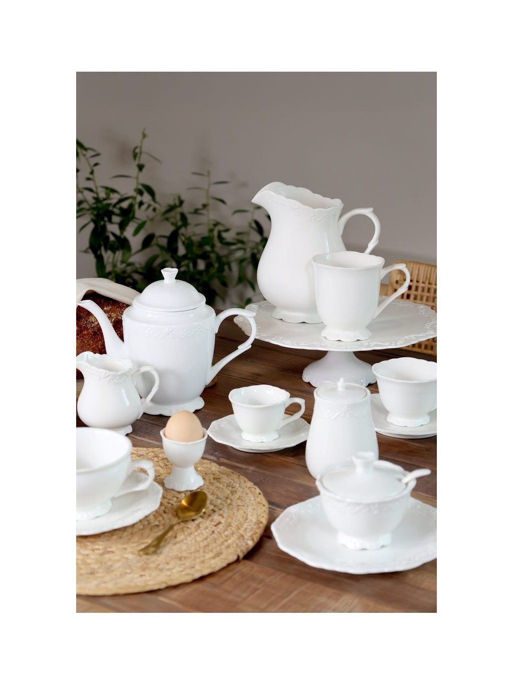 Podnos na koláče z kvalitného porcelánu zaujme svojím vyvýšeným tvarom a jemne zdobeným okrajom s vlnitým lemom a reliéfnym vzorom inšpirovaným francúzskou čipkou.