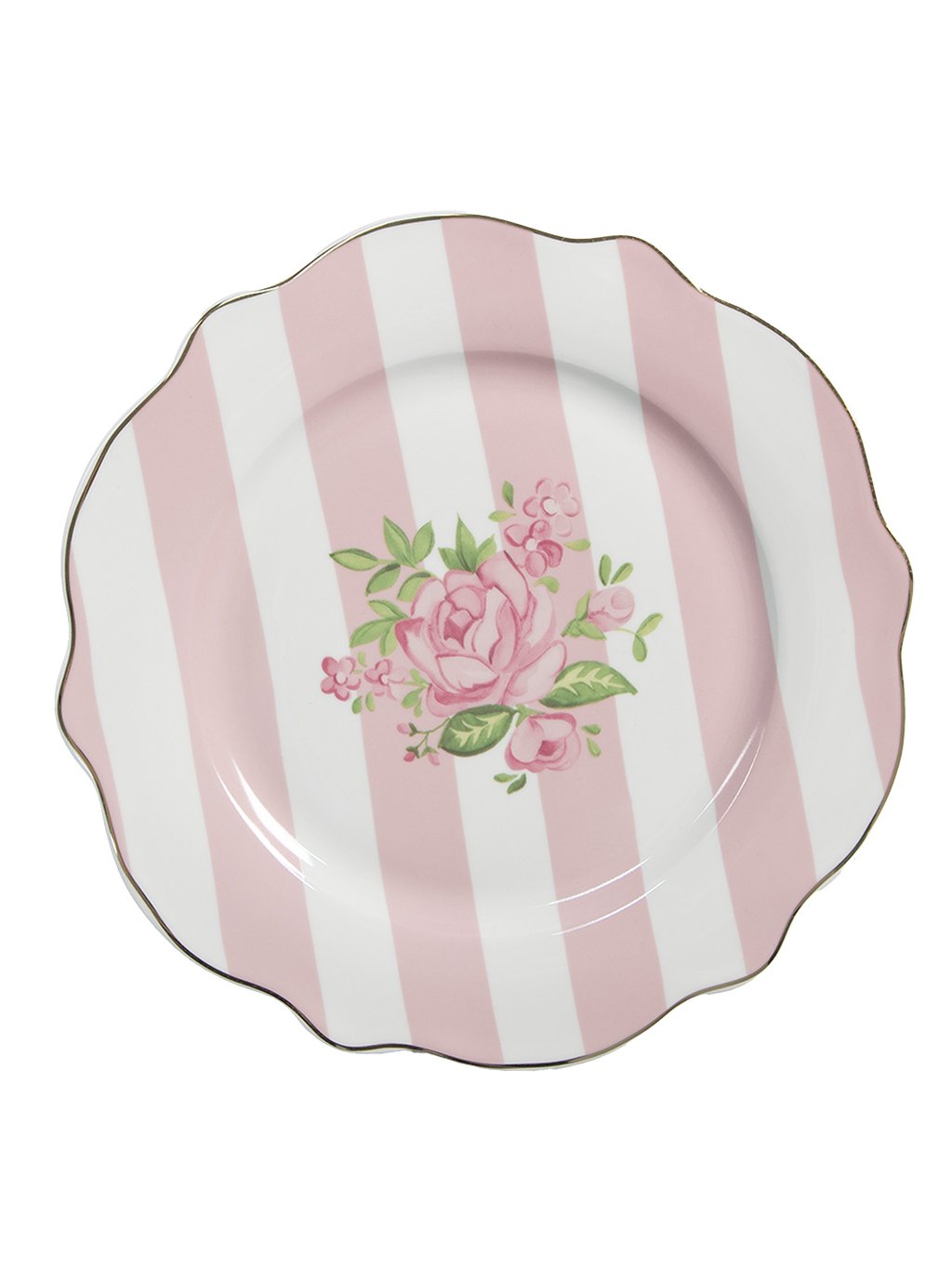 Kombinácia ružovo-bielych pruhov, kvetinového motívu ruží a zlatej linky po okraji vytvára elegantný vintage vzhľad. Tanier pôsobí nežne, no zároveň výrazne – perfektne sa hodí do romantického, vidieckeho aj klasického interiéru. Skvelo sa kombinuje s ďalšími kúskami z rovnakej série.