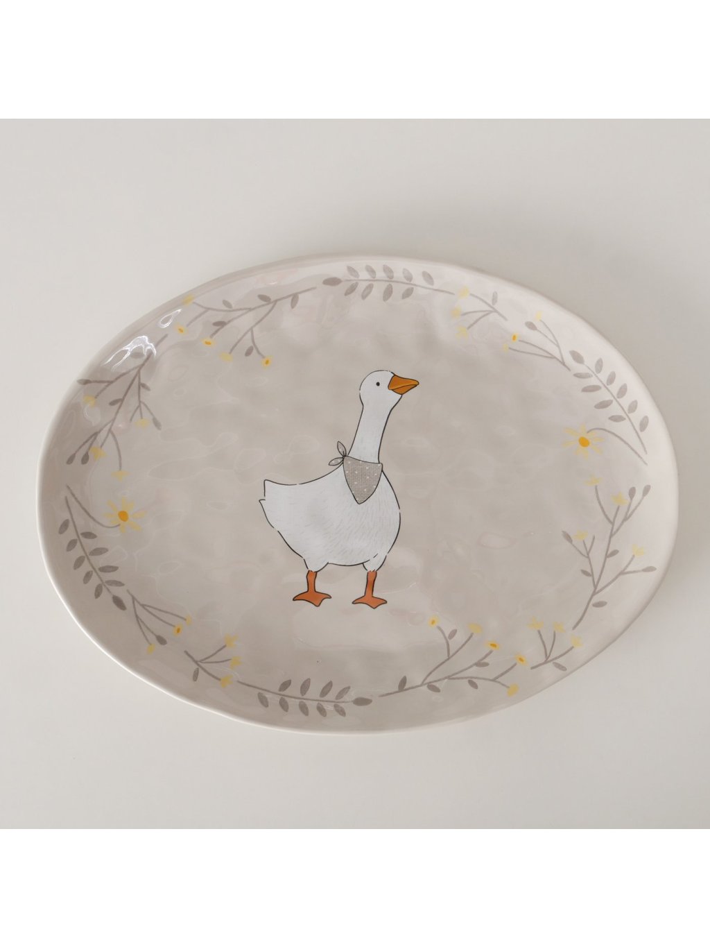 Oválny keramický servírovací tanier s nežným motívom húsky a kvetinového rámu je ideálny na sladké aj slané veľkonočné dobroty.