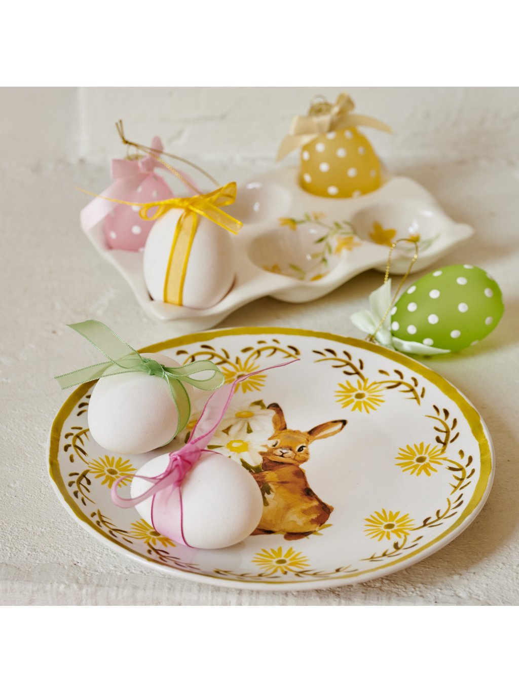 Porcelán je pevný, hladký a príjemný na dotyk. Tanier sa dobre kombinuje s jednoduchým bielym riadom aj s ďalšími sezónnymi kúskami. Hodí sa na veľkonočný stôl, ale pokojne ho nechajte v kuchyni aj dlhšie – má v sebe jemnosť, ktorá neunaví.