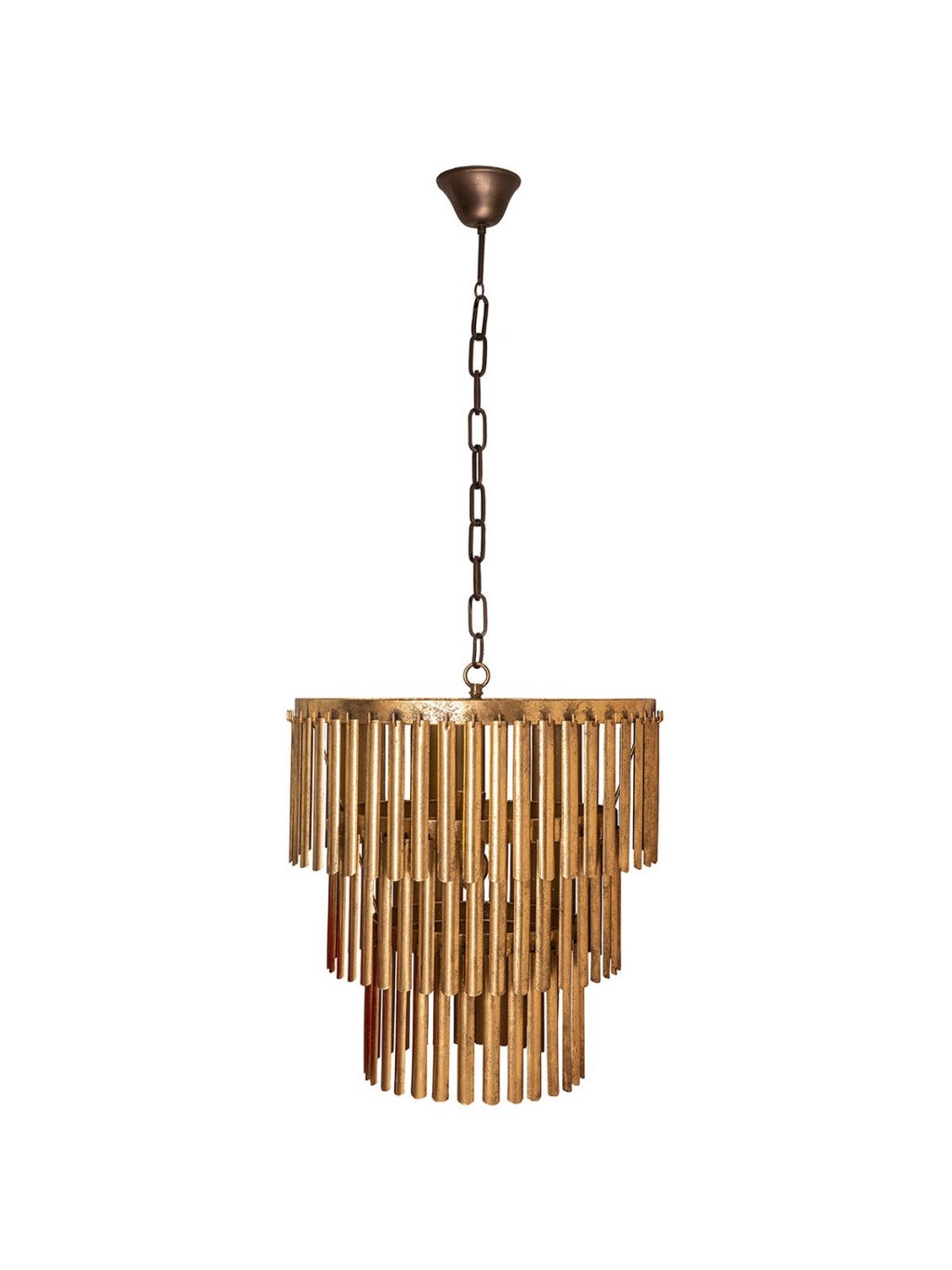 ✨ Vintage zlatý luster, ktorý okamžite pritiahne pozornosť a dodá miestnosti nádych noblesy. Jeho kovové zlaté lamely (odnímateľné) usporiadané do viacerých vrstiev vytvárajú jemnú hru svetla a tieňov, vďaka čomu pôsobí atmosféra útulne a elegantne.