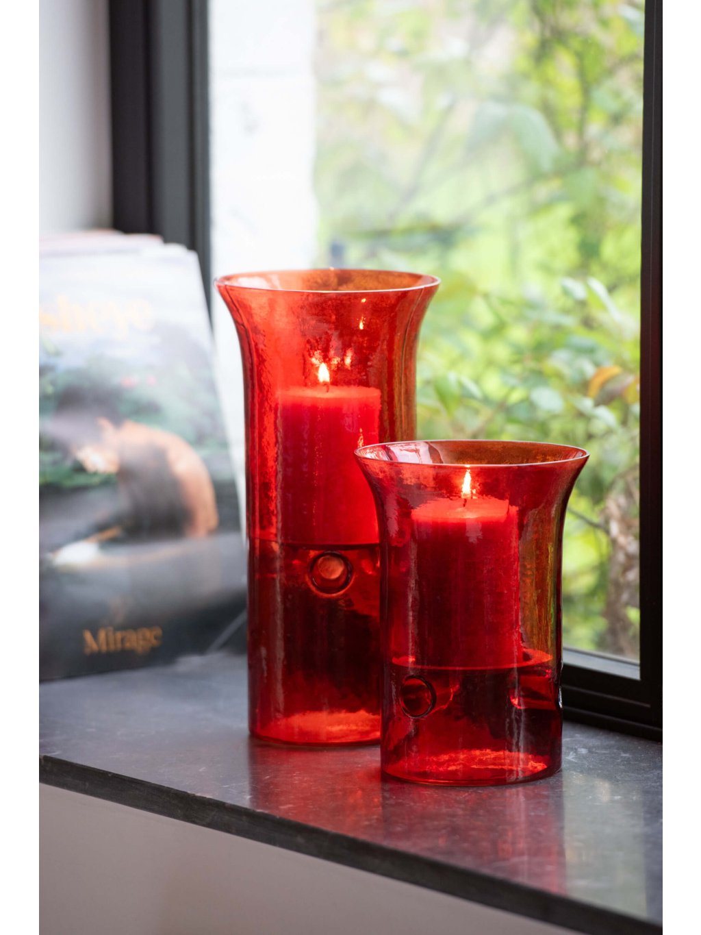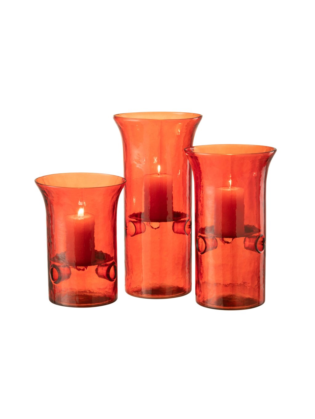 Každý svietnik je vyrobený z červeného skla, ktorého povrch jemne láme svetlo a pridáva plameňu ešte väčšiu hĺbku. Vďaka trom rôznym veľkostiam pôsobia veľmi dynamicky – môžete ich postaviť spolu ako harmonický celok, alebo rozmiestniť do rôznych kútov interiéru. Či už ich využijete počas sviatkov, alebo v bežných dňoch, vždy prinesú do priestoru pocit útulnosti a romantiky.