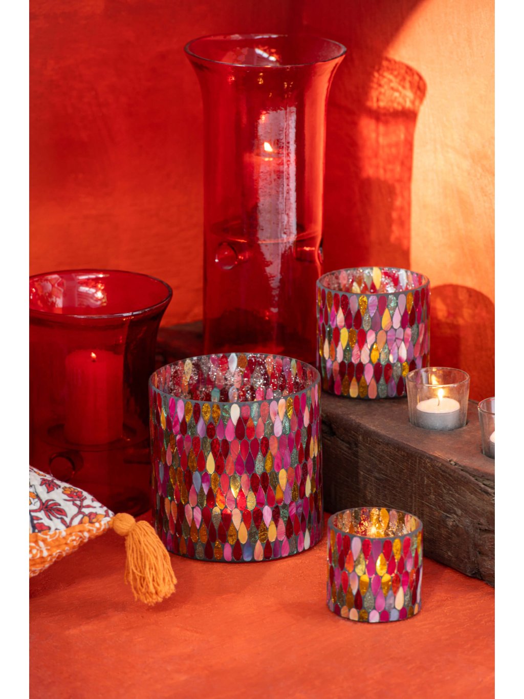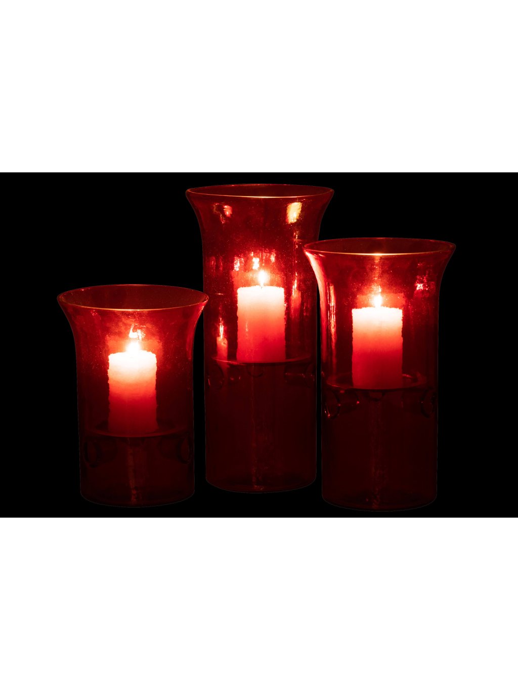 Ako žiariace plamienky ukryté v rubíne – tak pôsobia sklenené svietniky, ktoré premenia každý večer na hrejivý zážitok. Ich sýtočervený odtieň v spojení so svetlom sviečok vytvára kúzelnú atmosféru plnú tepla a intimity.
