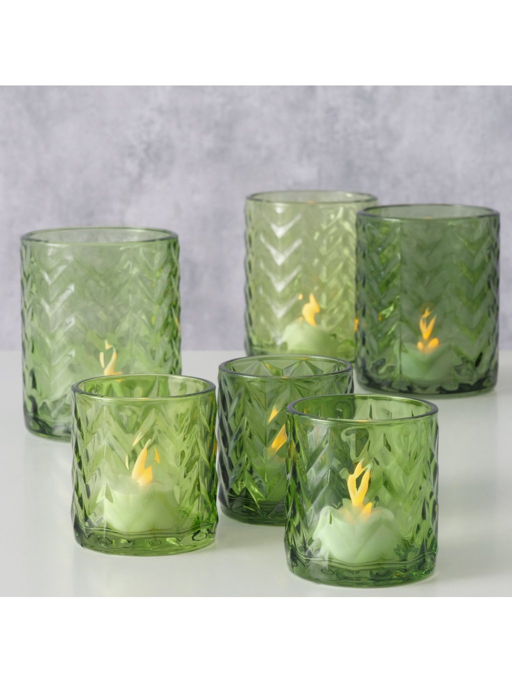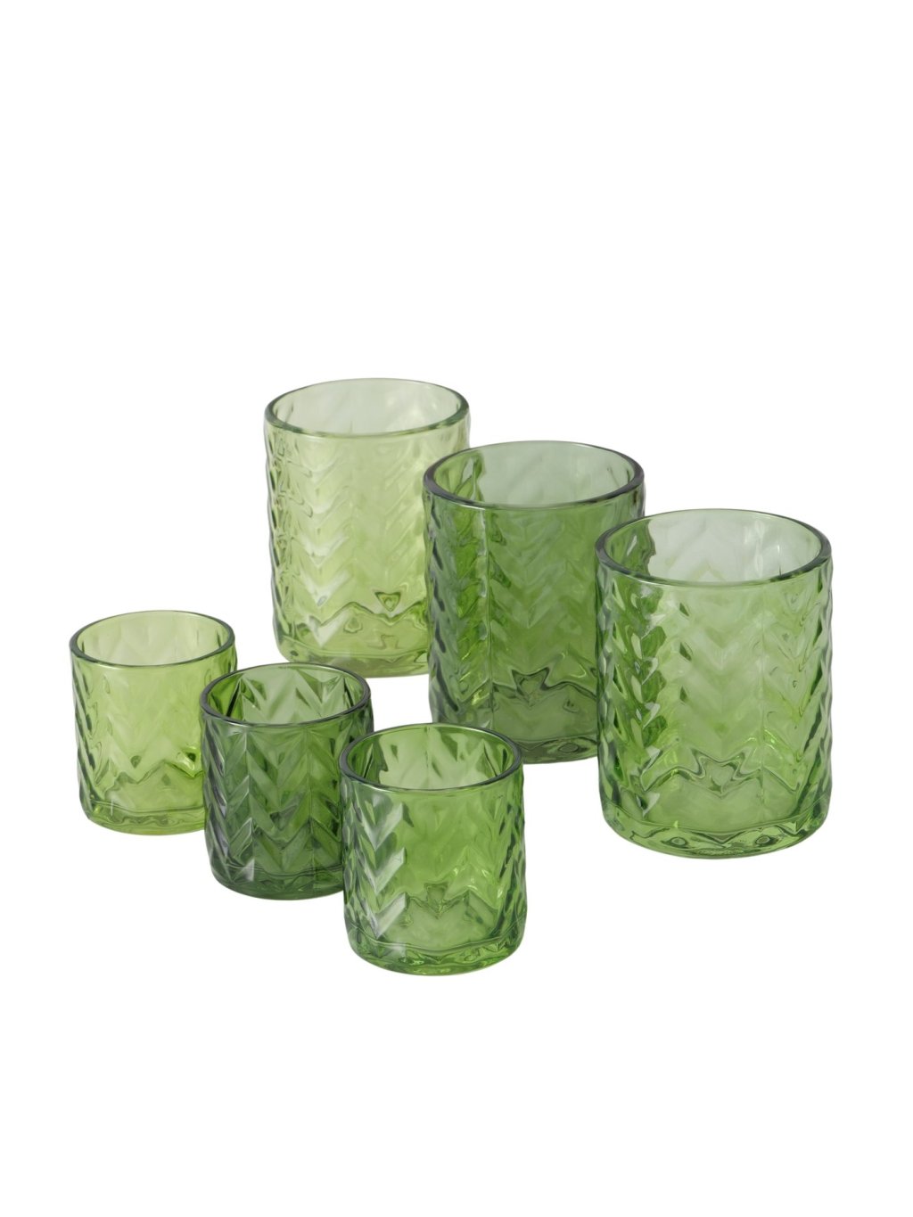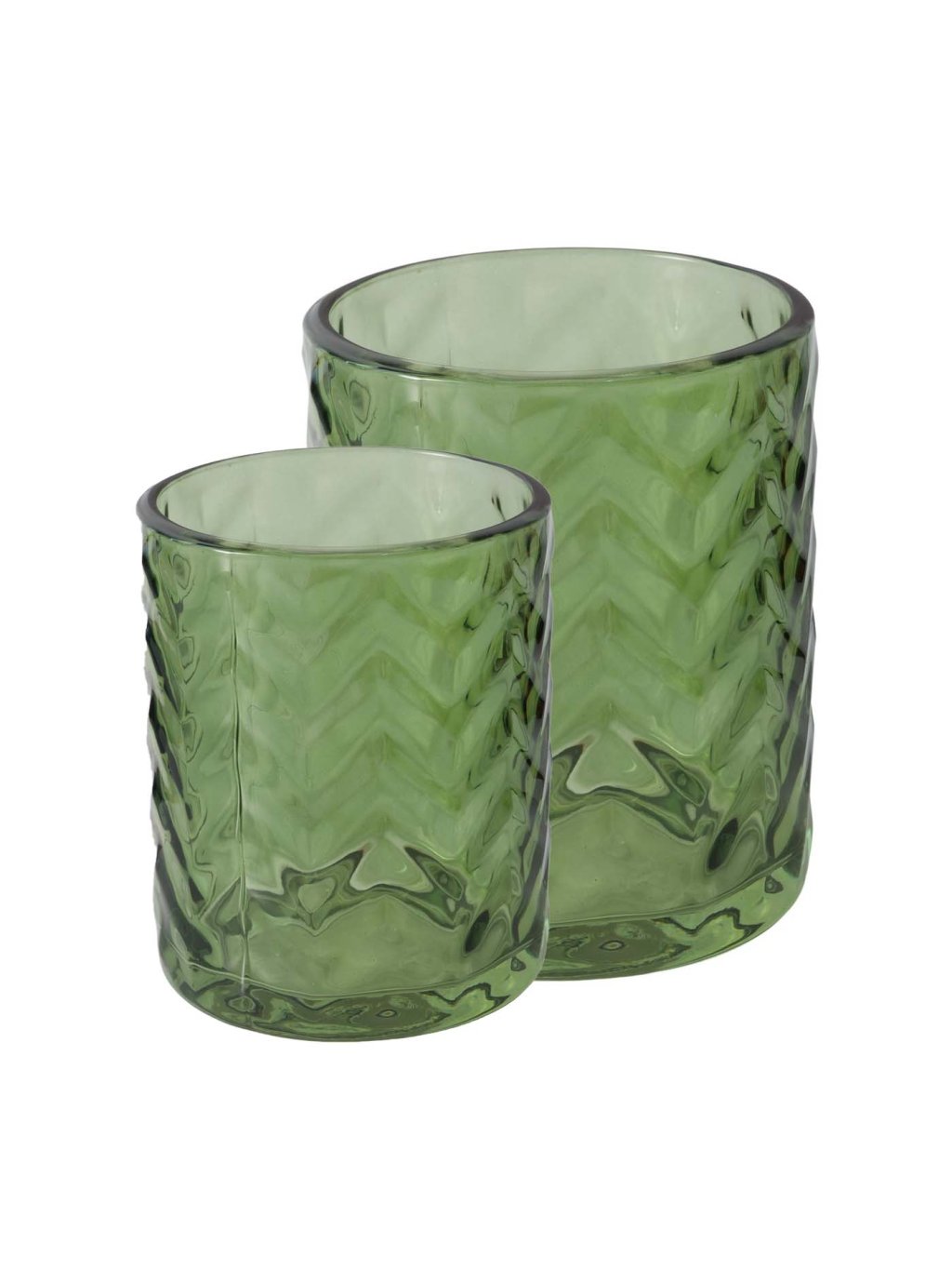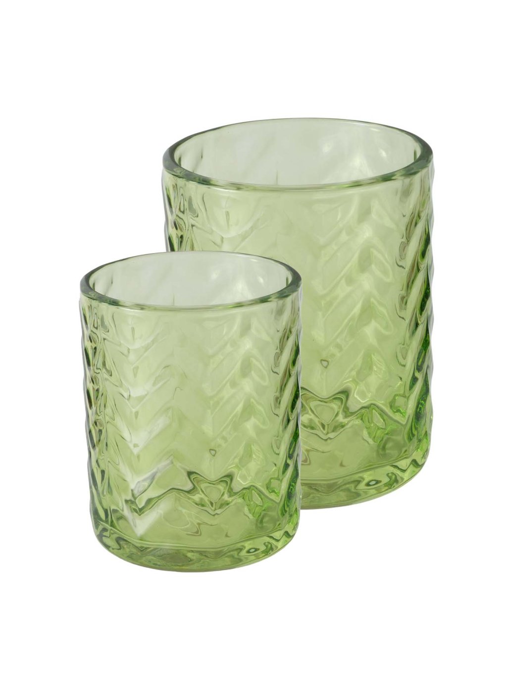 Sklenený svietnik Viko je dôkazom, že elegantný zelený odtieň s jemným reliéfnym vzorom pôsobí harmonicky a vytvára útulnú atmosféru – no v páre vyniknú ešte viac.