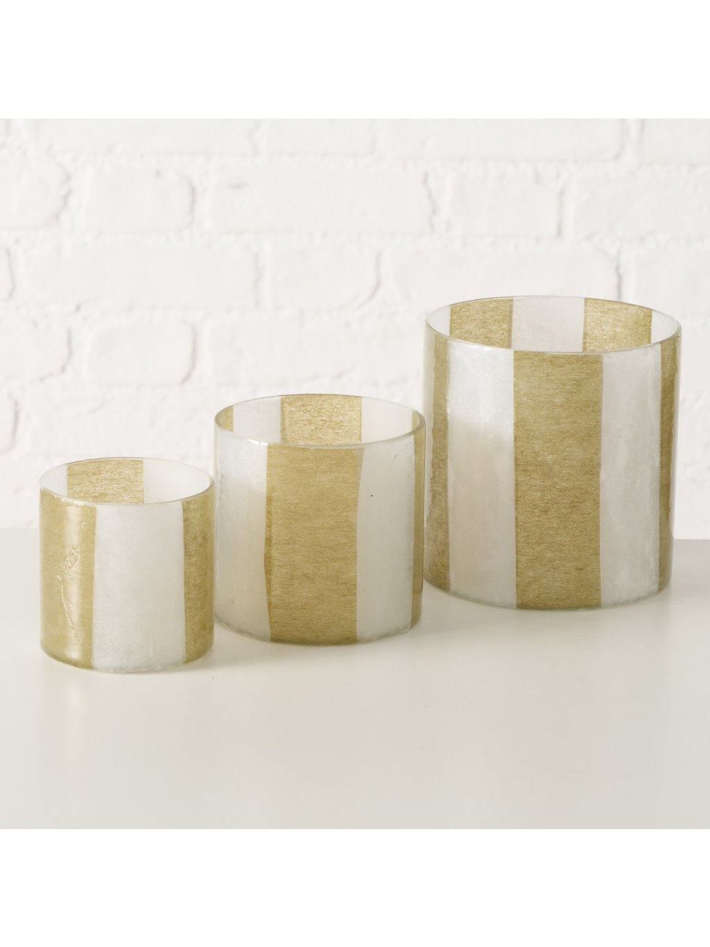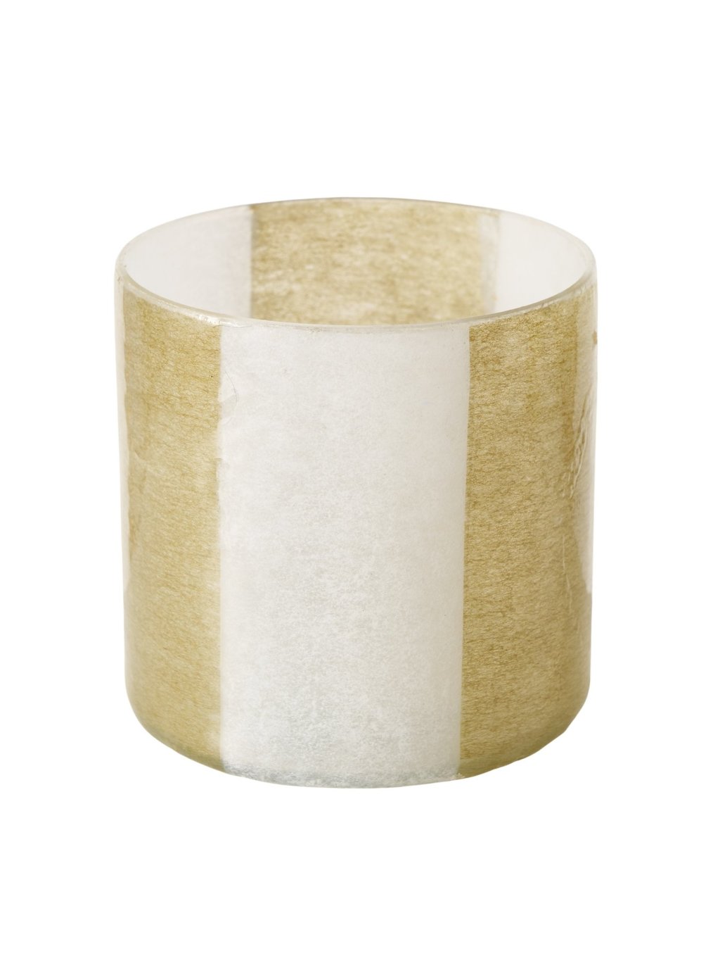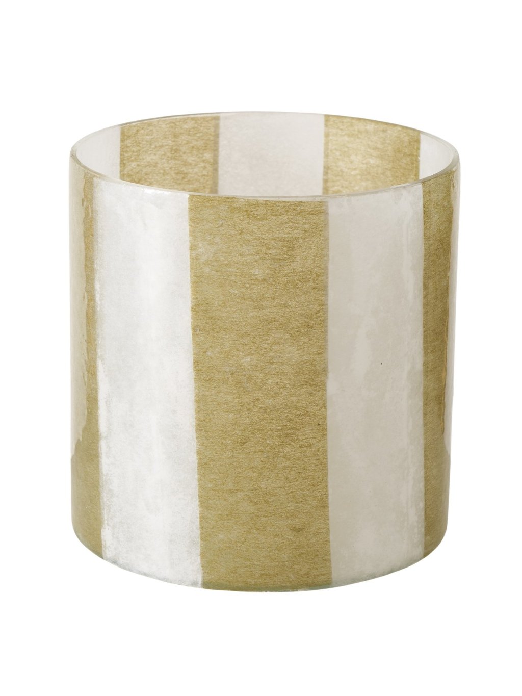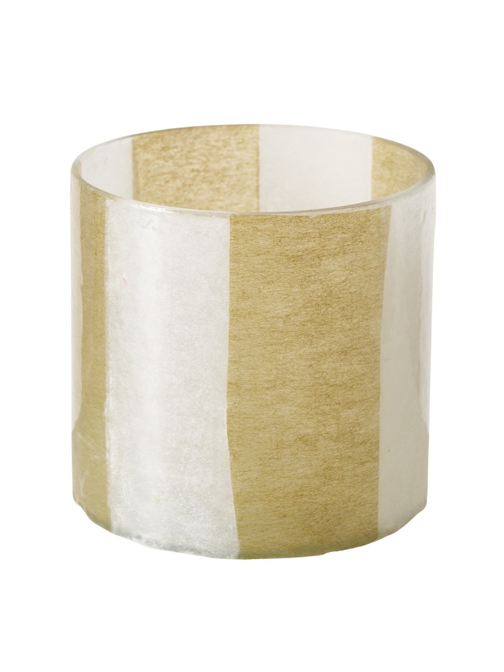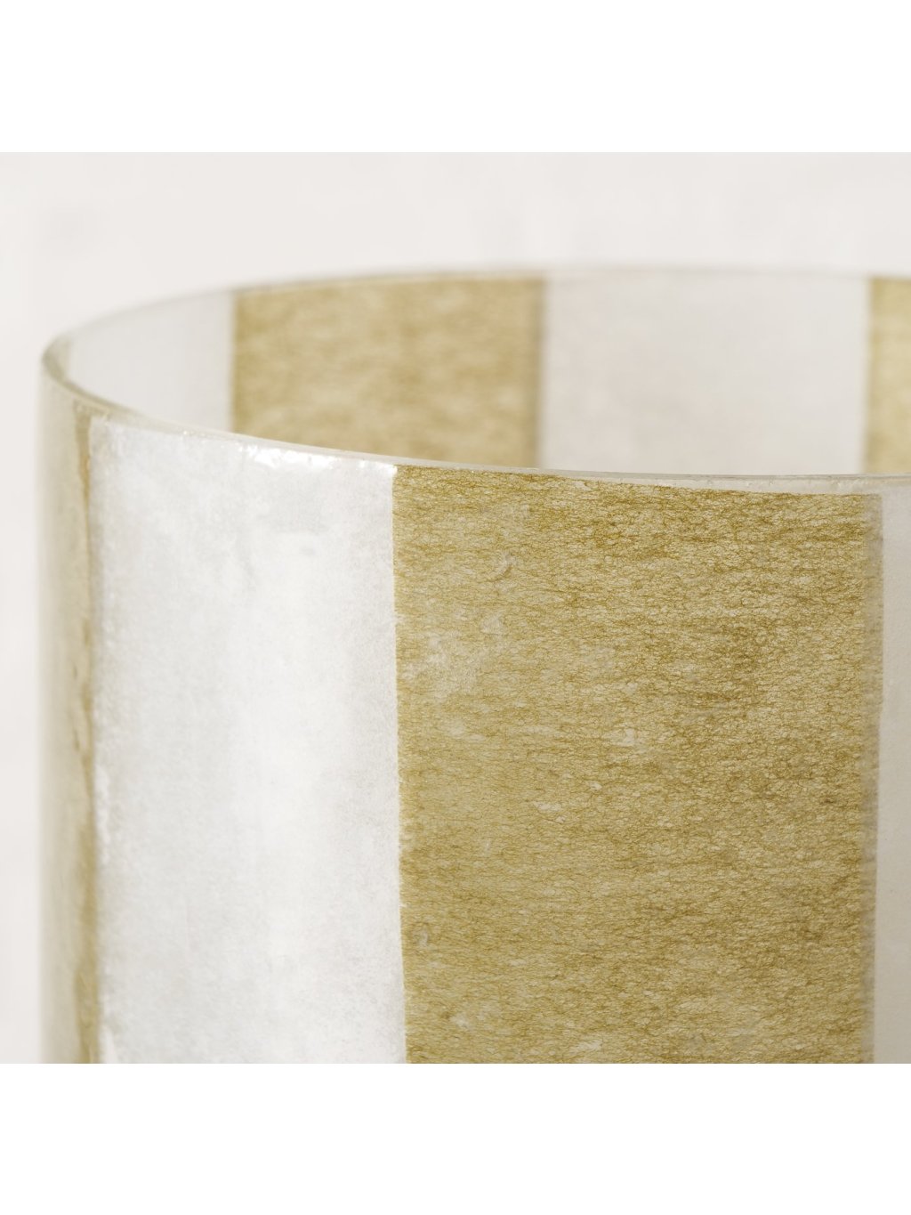 Ručne vyrábaný sklenený svietnik s jemným pruhovaným vzorom a lesklým povrchom krásne pracuje so svetlom sviečky.