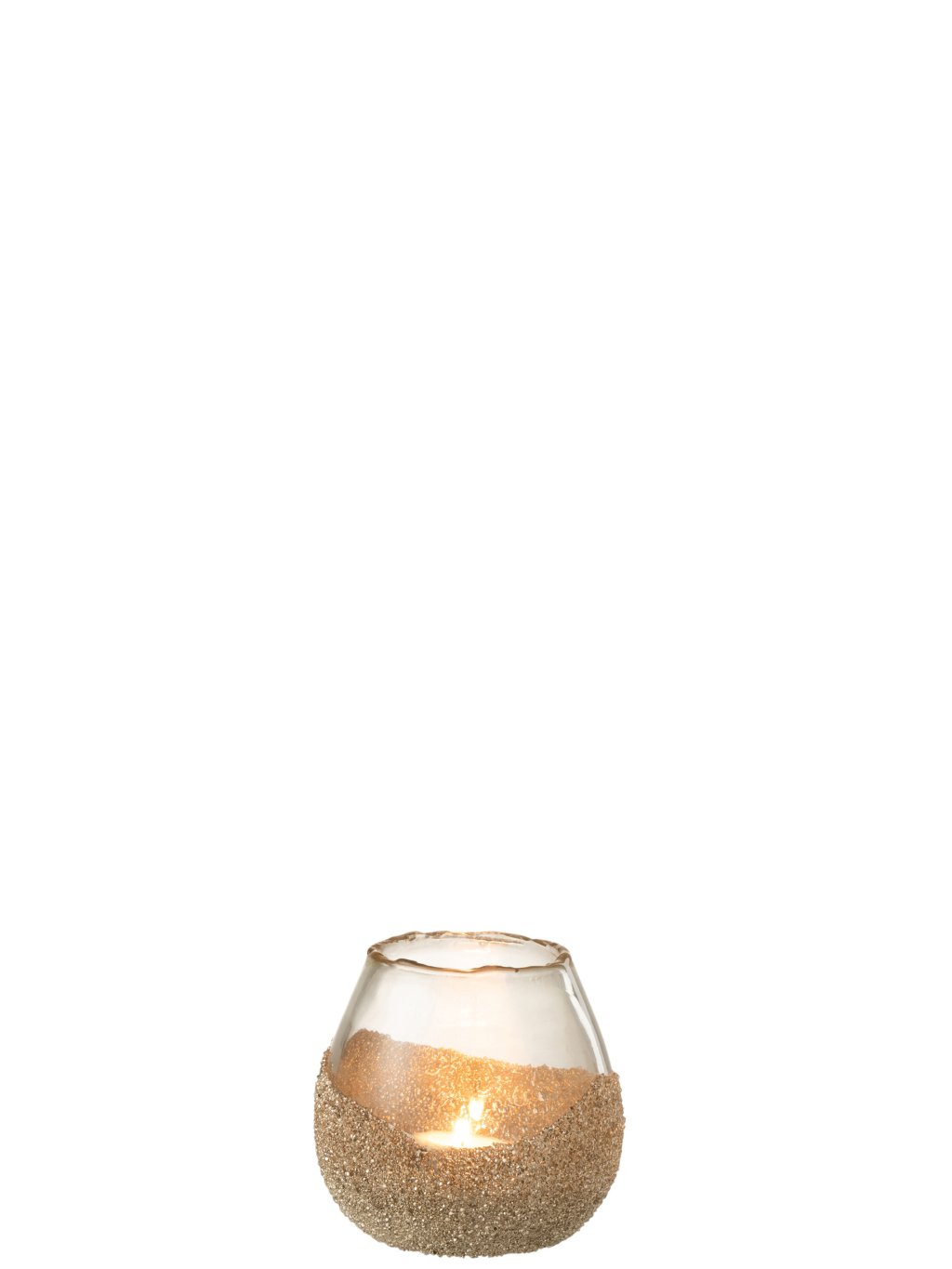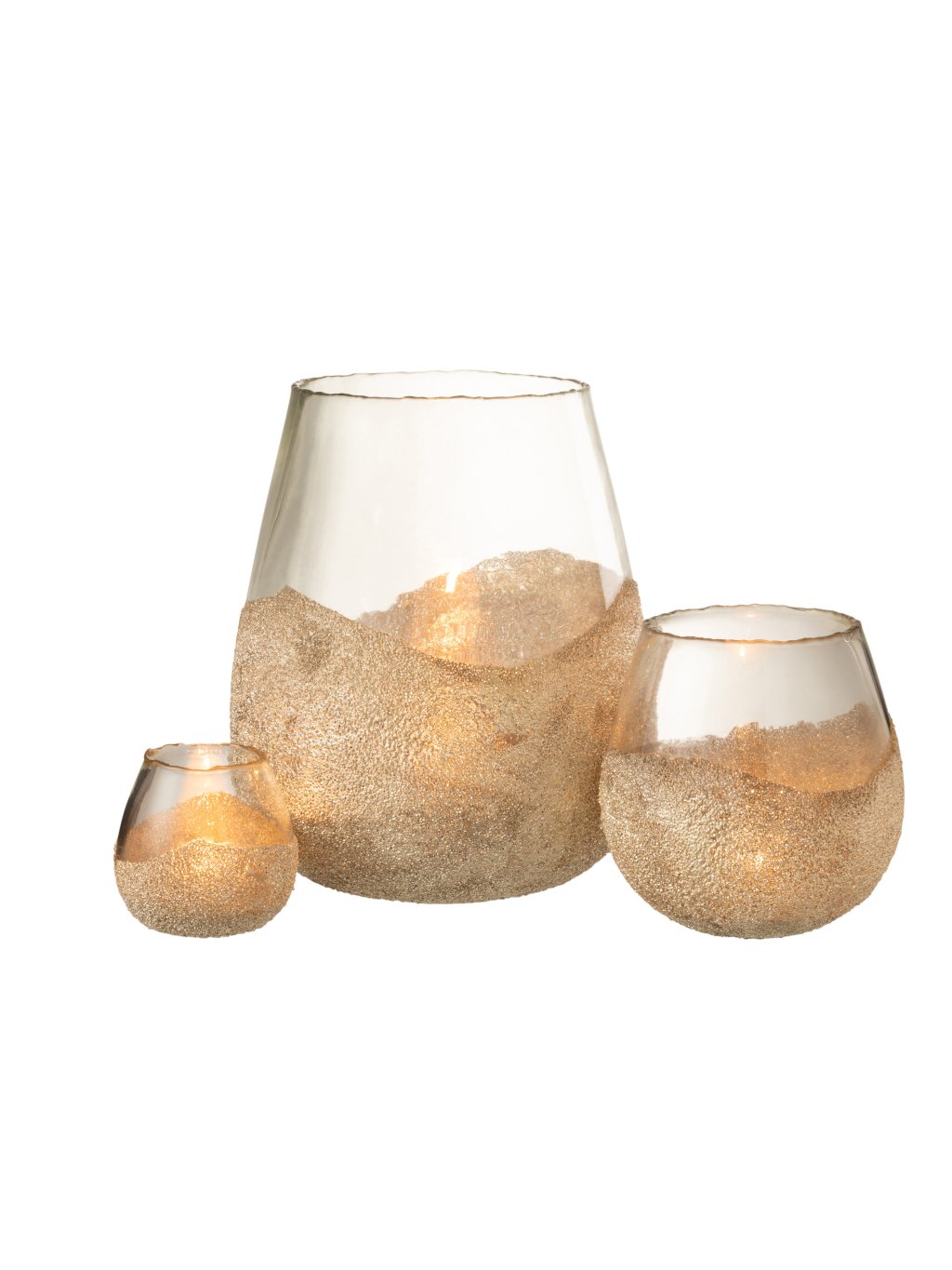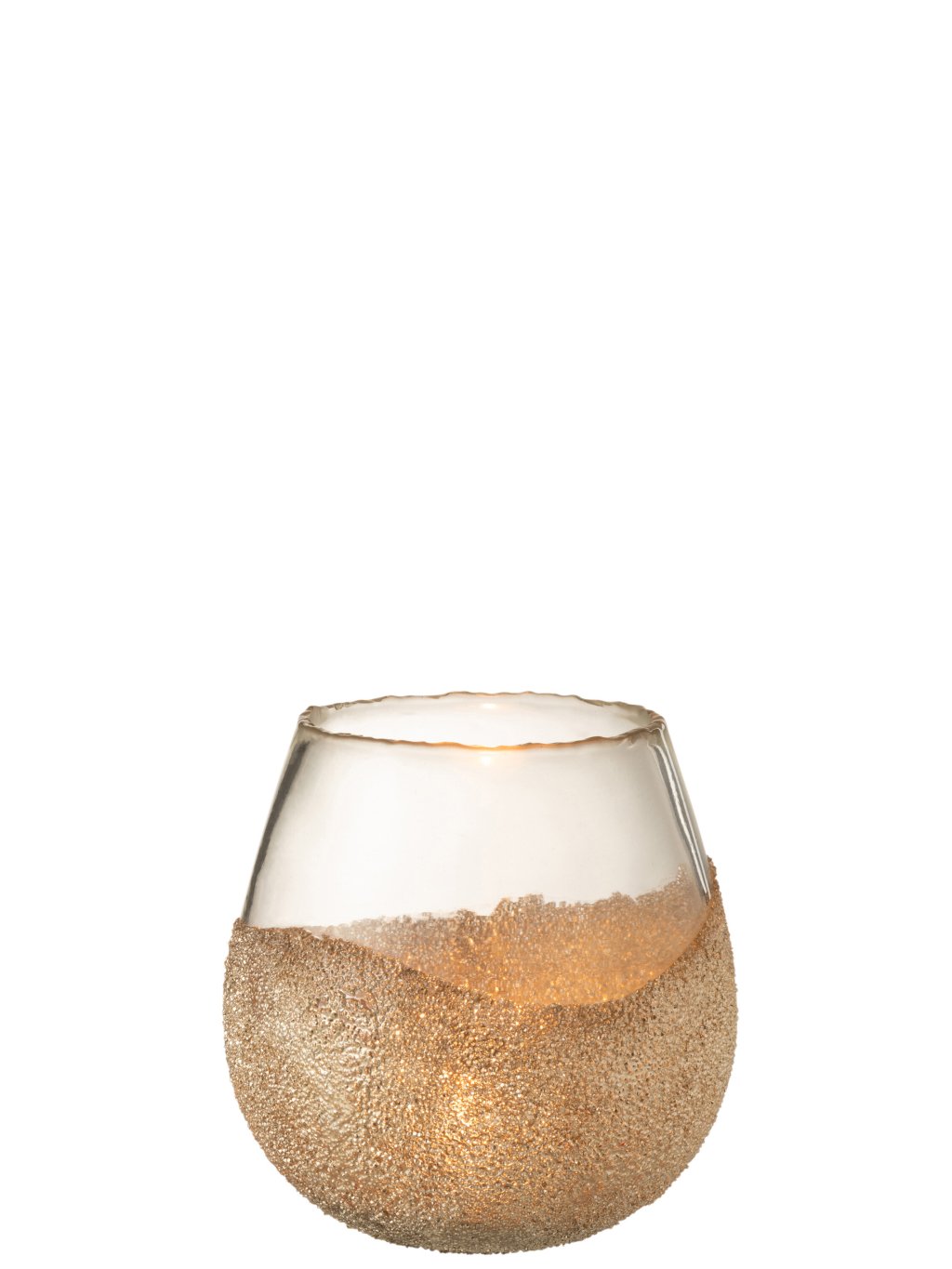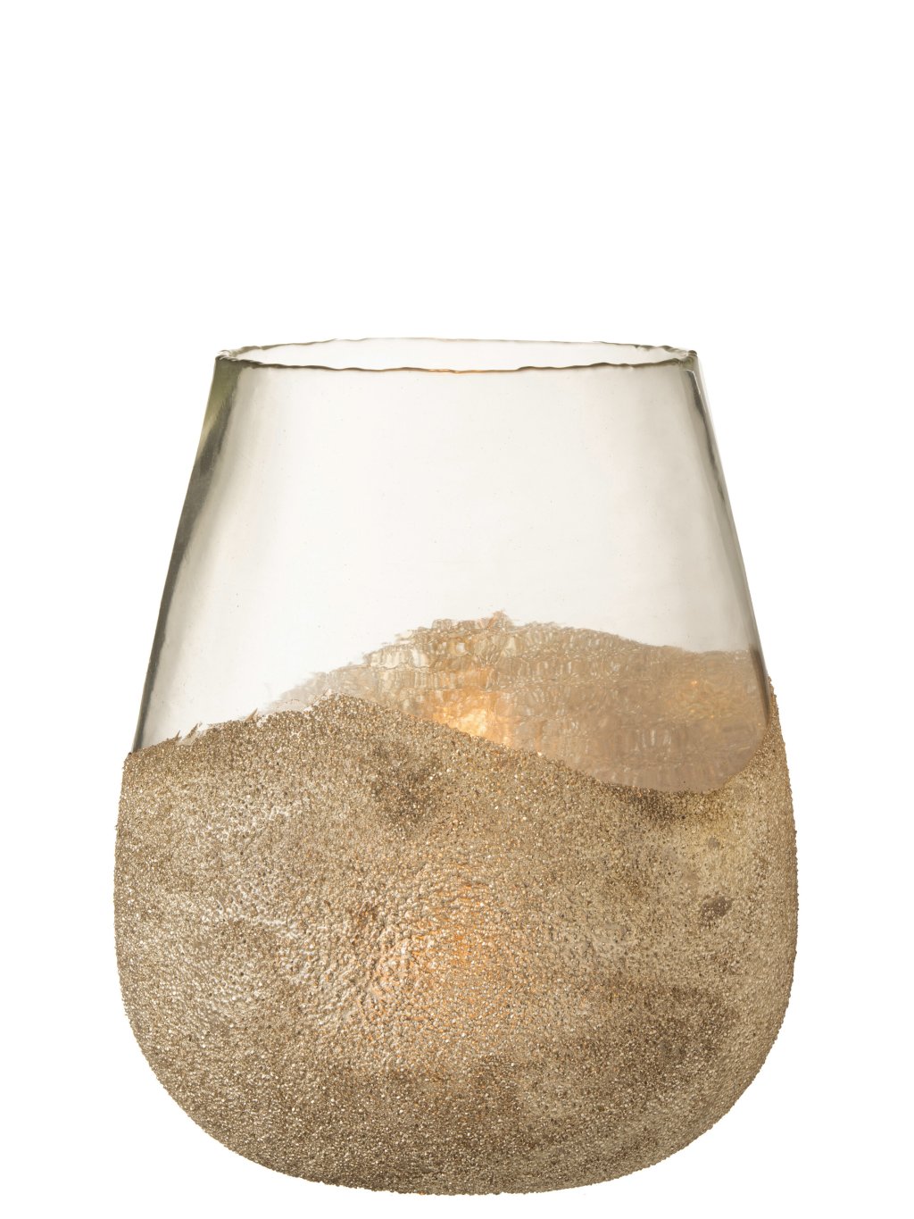 Tento sklenený svietnik je ako drahocenný klenot pre váš domov. Priehľadné sklo zdobené zlatistou perlovou štruktúrou vytvára jedinečný kontrast jemnosti a lesku. Akonáhle doň vložíte sviečku, premení sa na žiarivý akcent, ktorý naplní miestnosť hrejivým ligotom.