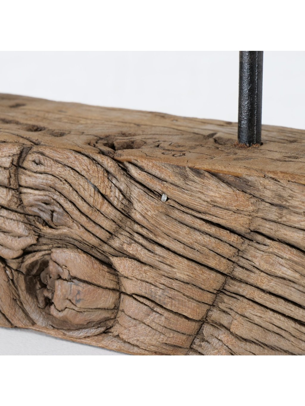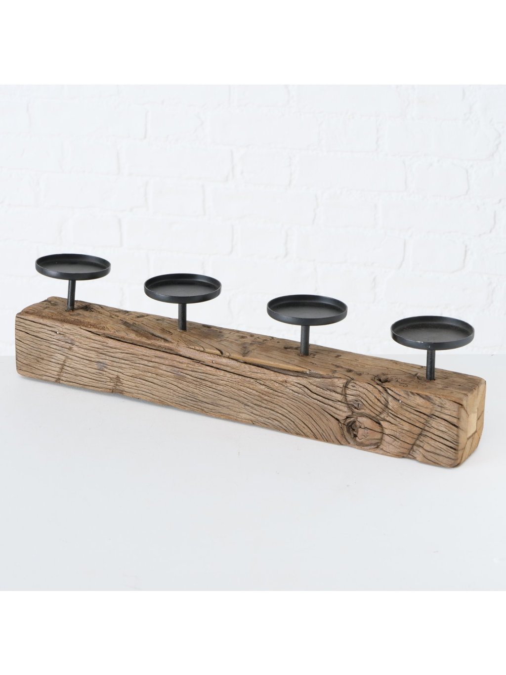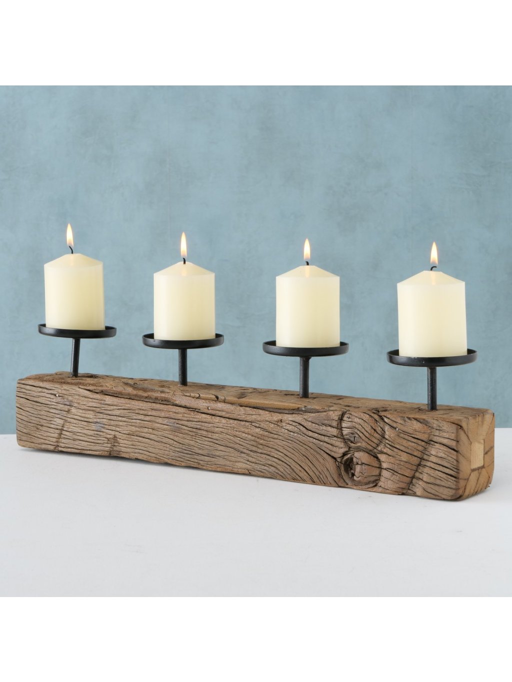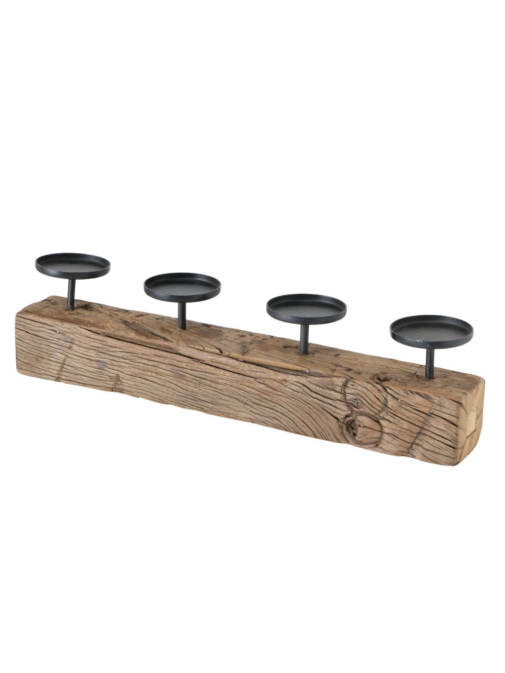 Ručne vyrábaný svietnik z recyklovaného dreva doplnený o kovové držiaky na štyri sviečky pôsobí autenticky a prirodzene.