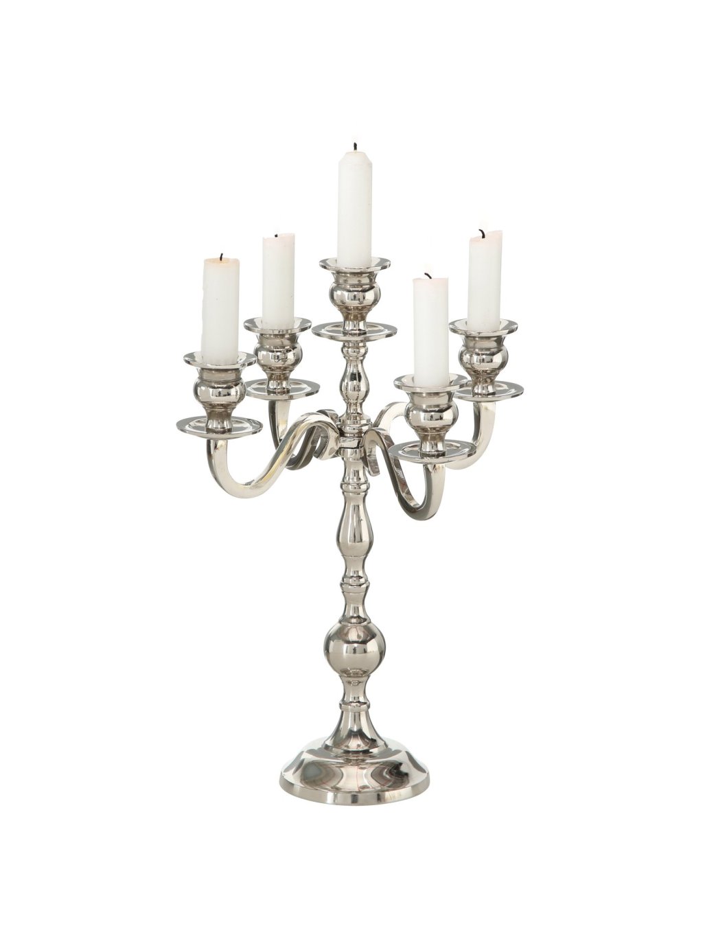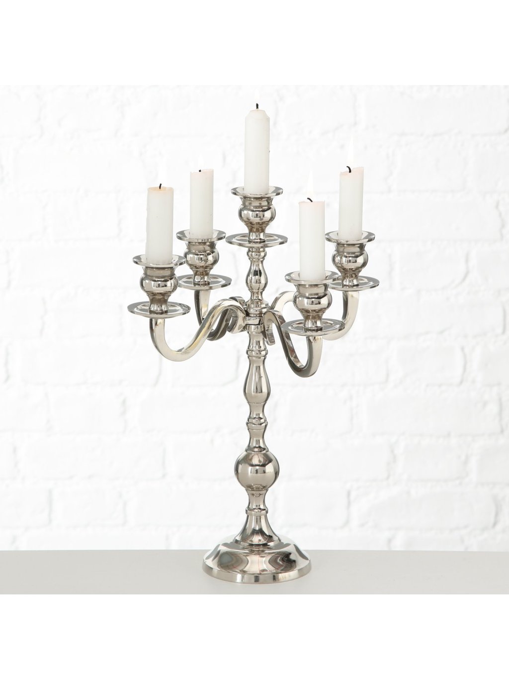 Strieborný svietnik Varas s výškou 50cm vnesie do vášho interiéru noblesu, ktorá je decentná a zároveň výrazná. Vďaka piatim ramenám poskytuje dostatok priestoru na sviečky a jeho lesklý povrch krásne odráža plamienky, čím vytvára jedinečnú atmosféru.