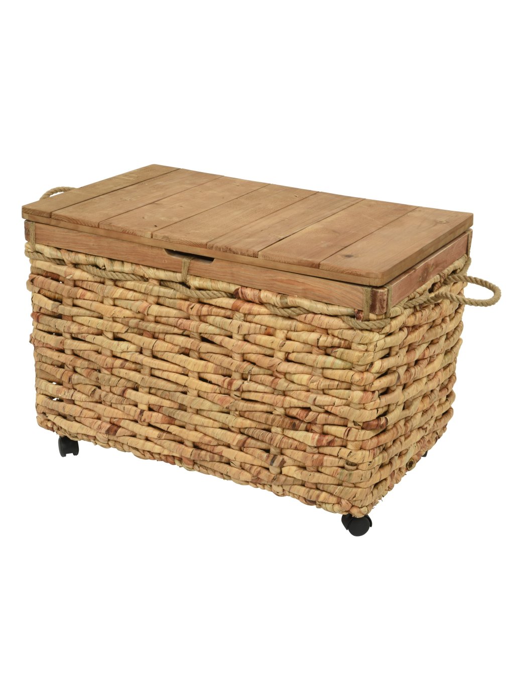Boxy sú ručne pletené z vodného hyacintu a doplnené o pevné veko z akáciového dreva, ktoré dodáva celku stabilitu a prirodzený vzhľad. Jemné hnedé tóny a dekoratívne lanové úchyty pôsobia teplo a harmonicky, vďaka čomu box zapadne do vidieckeho, boho aj moderného bývania.