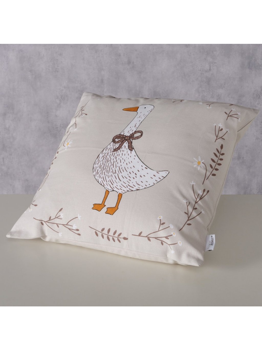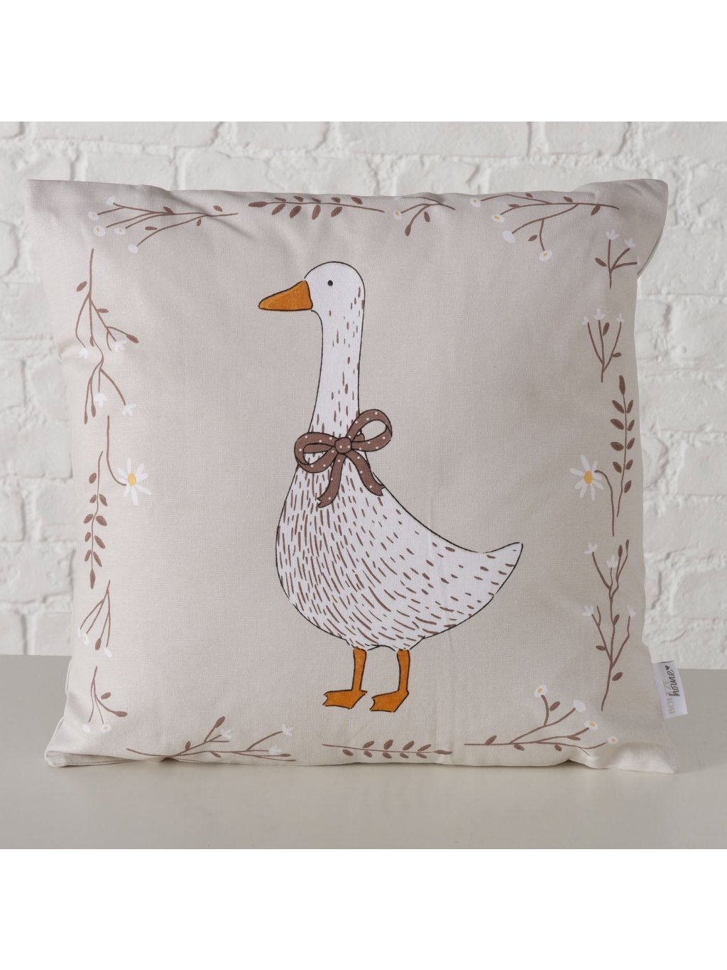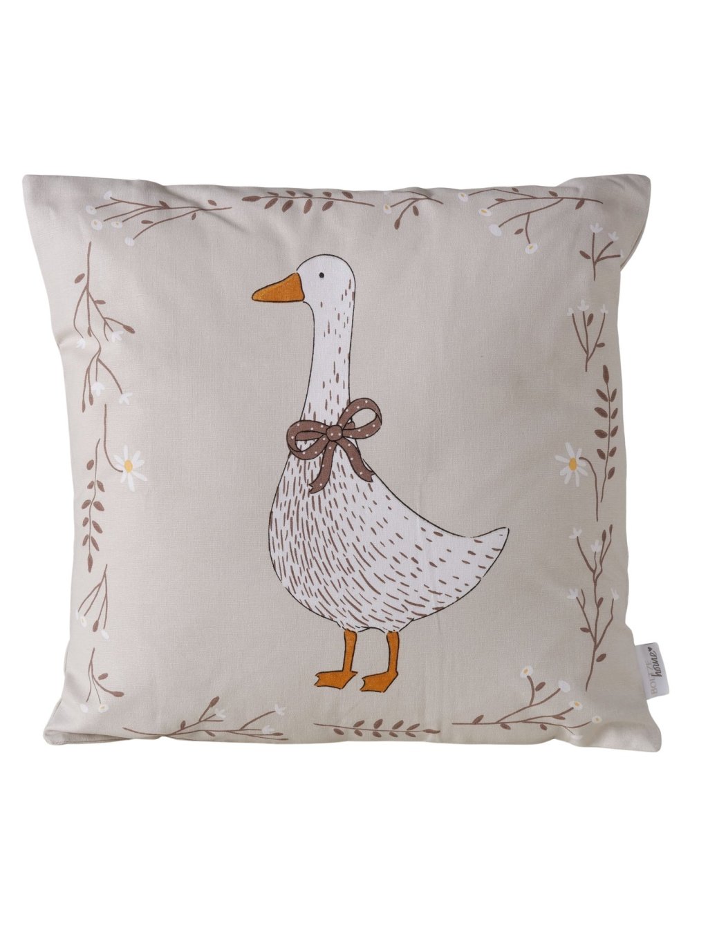 Vankúš Goosie 45×45 cm vnáša do interiéru jemný vidiecky pokoj a úsmev v jednom. Neutrálne tóny, milá huska s mašličkou a prírodný motív pôsobia ľahko, teplo a veľmi domácky. Ideálny doplnok na gauč, lavicu či posteľ, ktorý zútulní priestor bez zbytočnej okázalosti a krásne zapadne do jarného aj celoročného bývania. 🦢🤍