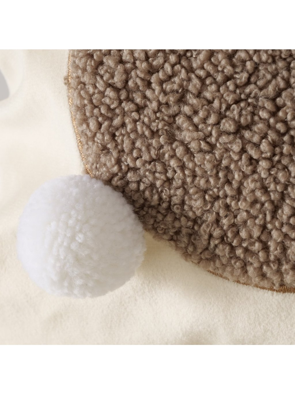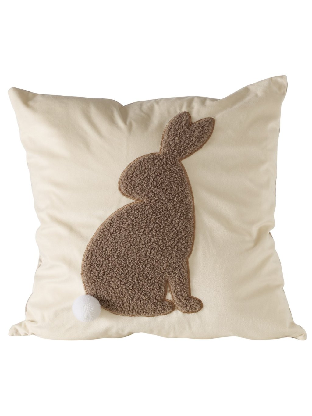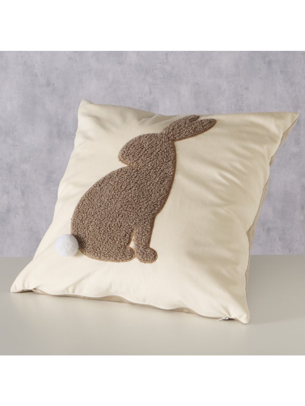 Vankúš je vyrobený z kombinácie nylonu a polyesteru s plyšovým povrchom, ktorý je mäkký na dotyk a pôsobí útulne. Plastický motív zajačika s jemným brmbolcom ako chvostíkom dodáva vankúšu hravosť, no stále zostáva vkusný a elegantný.