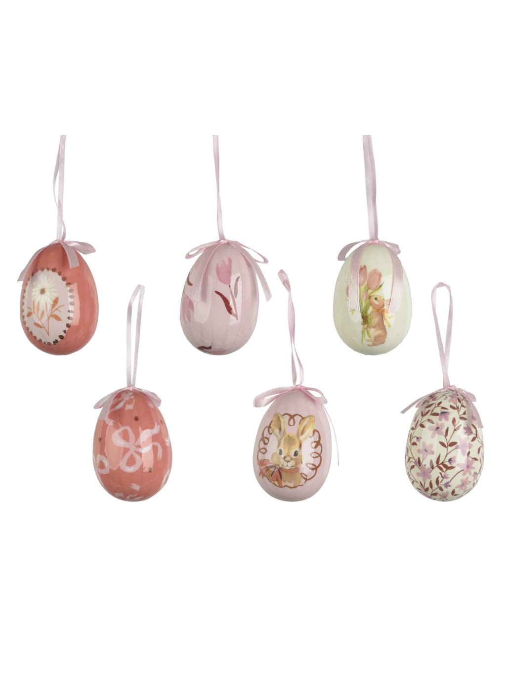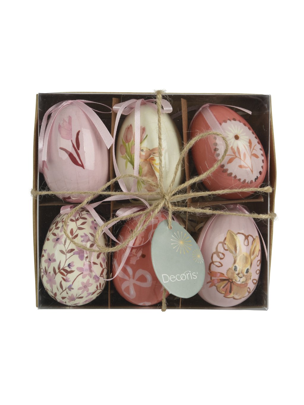 Sada šiestich dekoračných kraslíc zaujme rôznorodými motívmi – kvetmi, mašličkami aj veľkonočnými symbolmi v mäkkých ružových, krémových a zemitých odtieňoch.