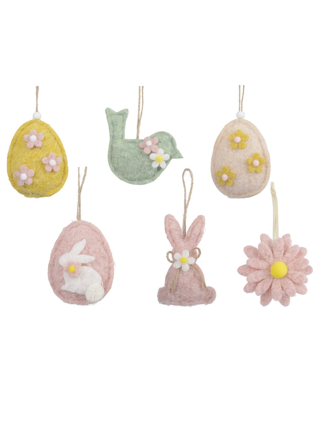 Dekorácie sú vyrobené z mäkkej plsti s „vareným“ vlneným vzhľadom, doplnené o pompóniky a filcové kvietky 🌼 Vďaka závesnej šnúrke ich jednoducho zavesíte na vetvičky, veniec, kľučku či okno – a jar je u vás doma raz-dva 🌿