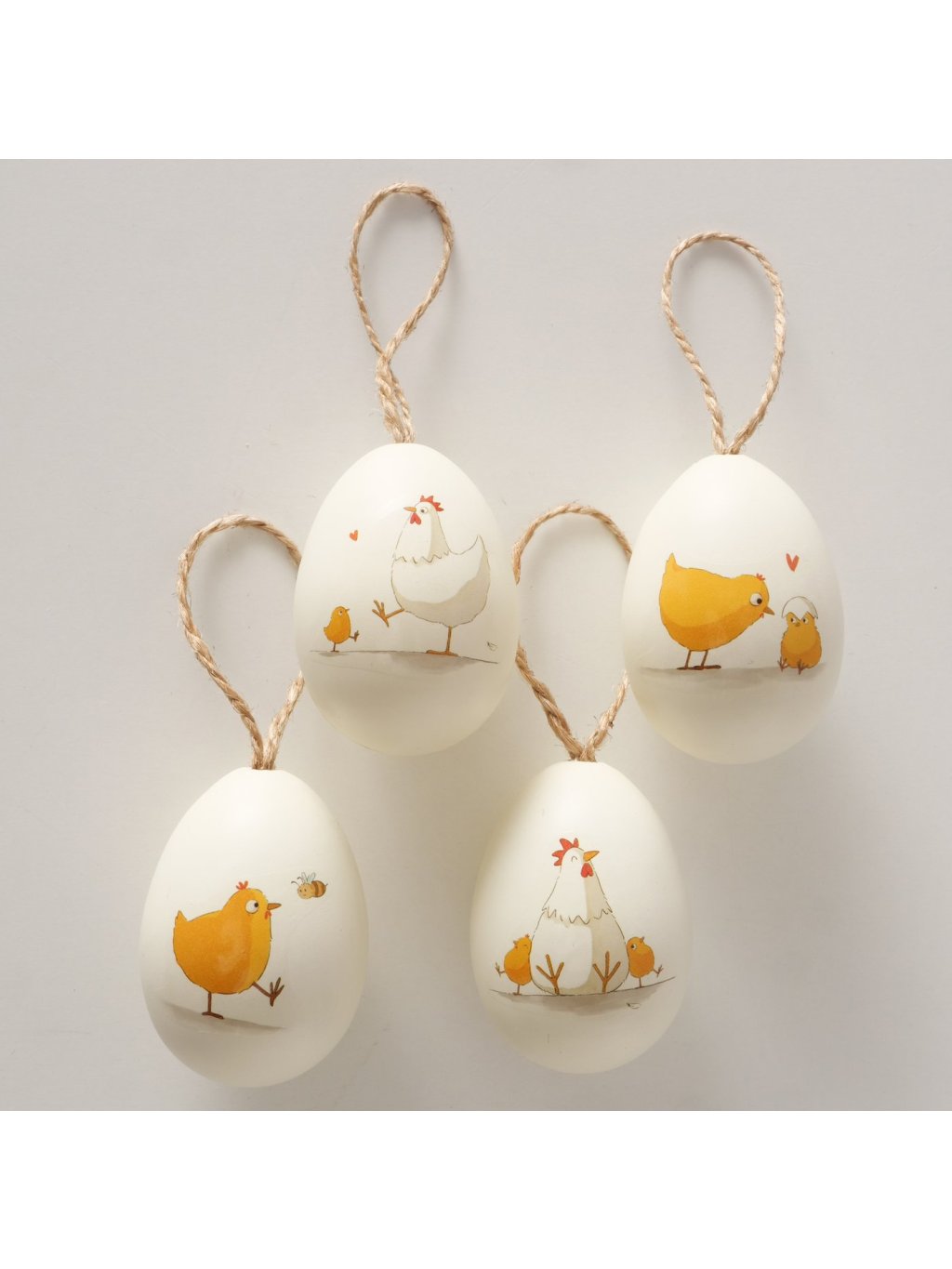 Tieto ľahké plastové vajíčka sú ideálne na vnútornú dekoráciu – na vetvičky vo váze, jarné aranžmány či ako milý detail na madlo alebo okno. Vďaka jutovému pútku sa jednoducho zavesia a krásne vyniknú samostatne aj v skupine. Motívy sú jemne farebné, nevtieravé a vhodné do moderného aj vidieckeho interiéru.
