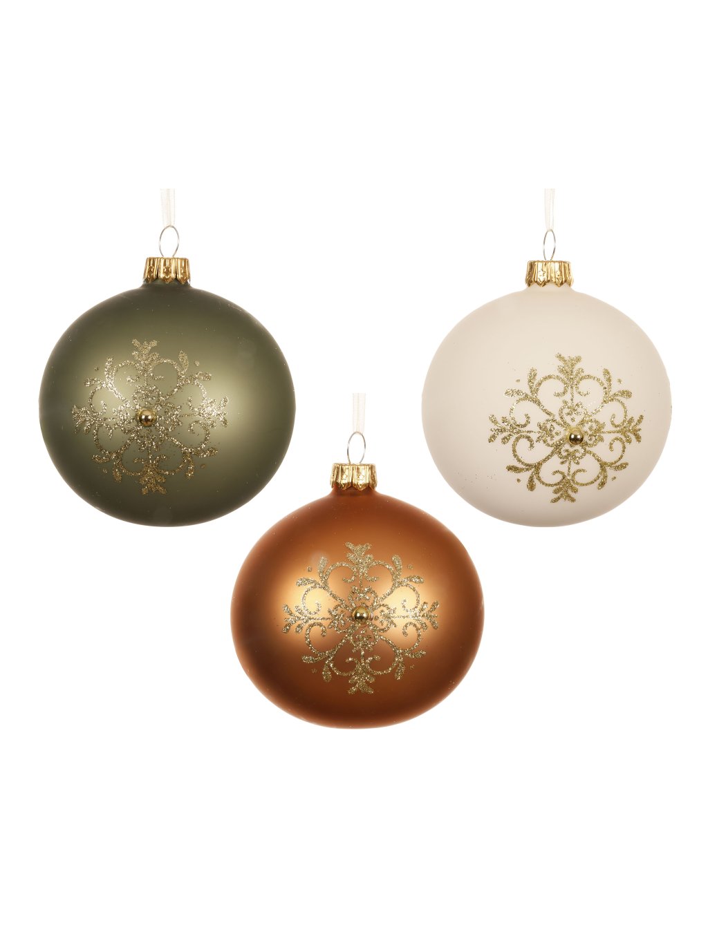 Tieto elegantné sklenené gule s jemným zlatým medailónovým vzorom dodajú vášmu stromčeku šmrnc klasickej noblesy. Vďaka matnému povrchu pôsobia decentne, no trblietavá dekorácia im dodáva slávnostný nádych, ktorý krásne zachytáva svetlo vianočných svetielok.