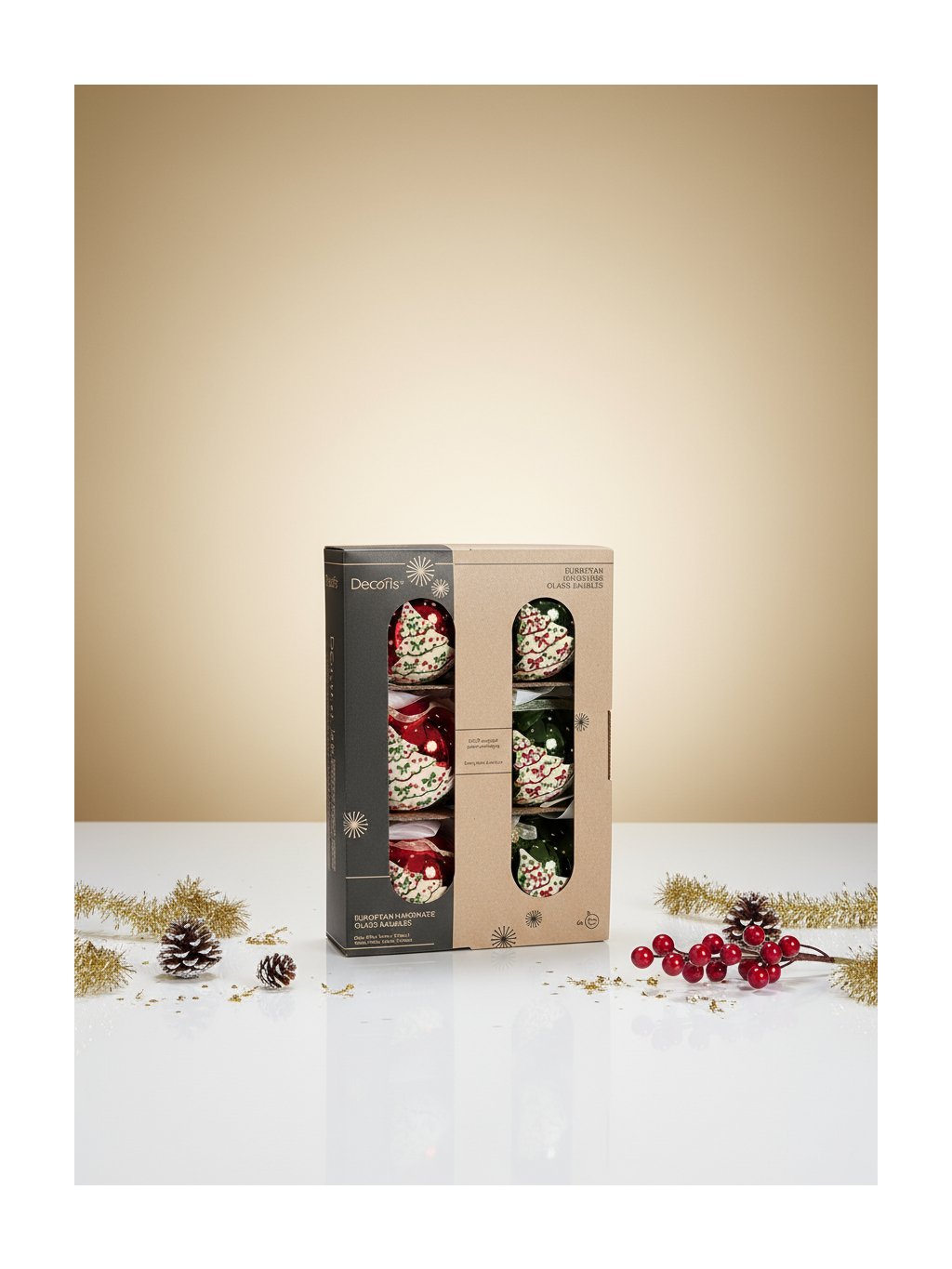 🌲 Sada 6 gulí v klasickej červenej a tmavozelenej farbe prináša na stromček nádych nostalgie a domácej pohody. Každá guľa je ozdobená bielym vianočným stromčekom, posiatym drobnými mašličkami a vetvičkami, ktoré pôsobia veselým a zároveň elegantným dojmom. Vďaka lesklému povrchu sa krásne odrážajú svetlá reťazí, čím vytvárajú jemný trblietavý efekt. Priemer 8cm je ideálny na kombinovanie – guľky pôsobia dostatočne výrazne, no stále ladne zapadnú medzi ostatné ozdoby.