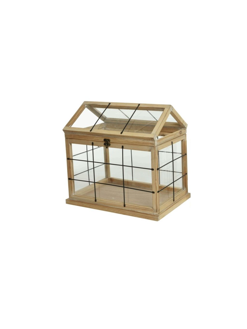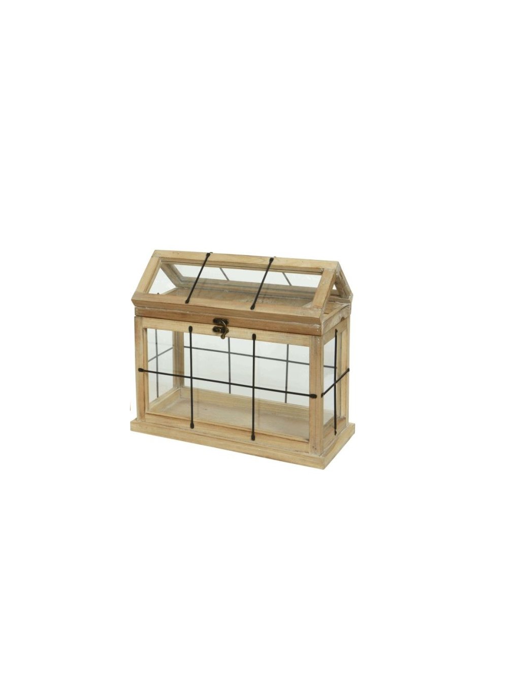 Kombinácia smrekového dreva, skla a čierneho kovového drôtu pôsobí prirodzene a nadčasovo. Otváracia strecha robí skleník nielen krásnym, ale aj praktickým – či už doň uložíte rastlinky, sviečky alebo sezónne dekorácie.