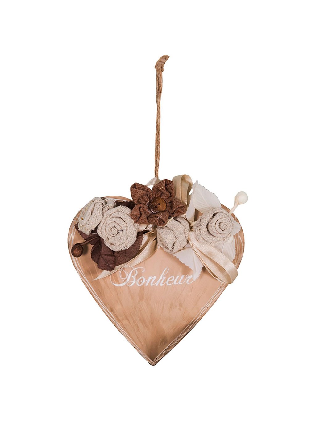 💛 Romantický detail, ktorý rozžiari každý kút domova – presne také je toto závesné kovové srdce Bonheur s rozmermi 16 × 3 × 16 cm. Jeho medený odtieň pôsobí teplo a útulne, zatiaľ čo ozdobné kvety z textílie a mašličky mu dodávajú jemný vintage nádych. Francúzsky nápis „Bonheur“ (šťastie) krásne vystihuje, čo má tento doplnok priniesť – pohodu a radosť do vášho priestoru.