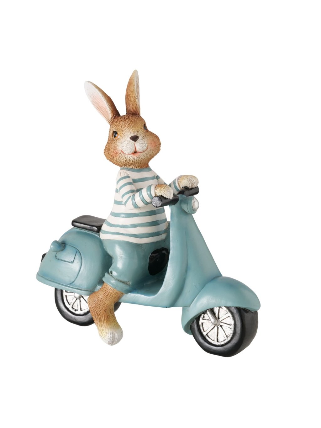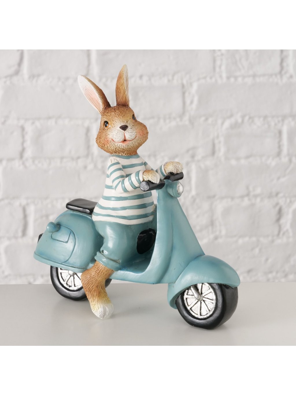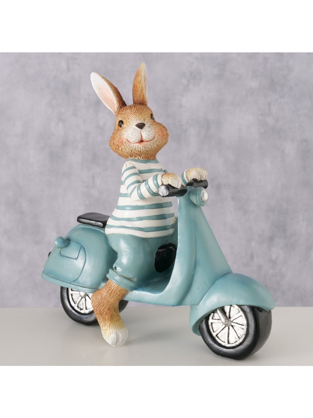 Zajac Jonas v pruhovanom tričku, sediaci na motorke v jemnom modrom odtieni, je dekorácia, ktorá okamžite zaujme. Pôsobí hravo, trochu retro a veľmi sympaticky – ako malý jarný príbeh zachytený v jednom momente.