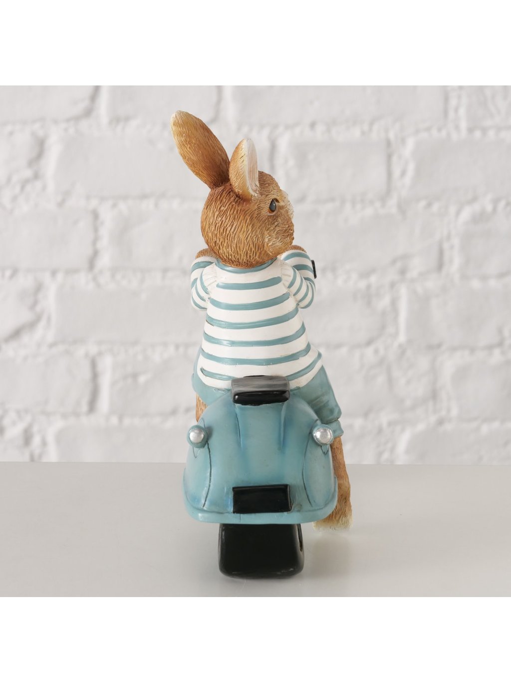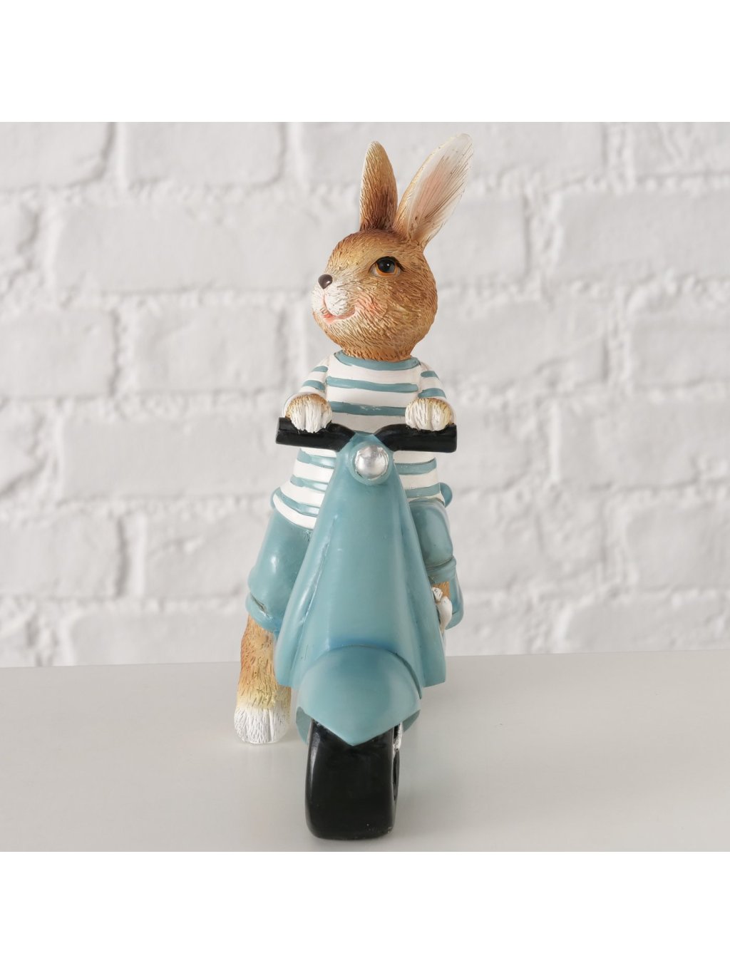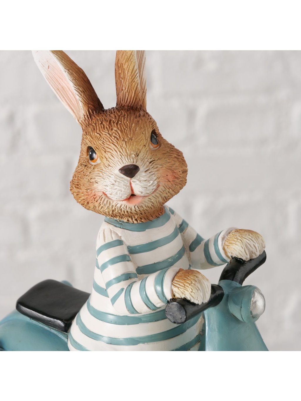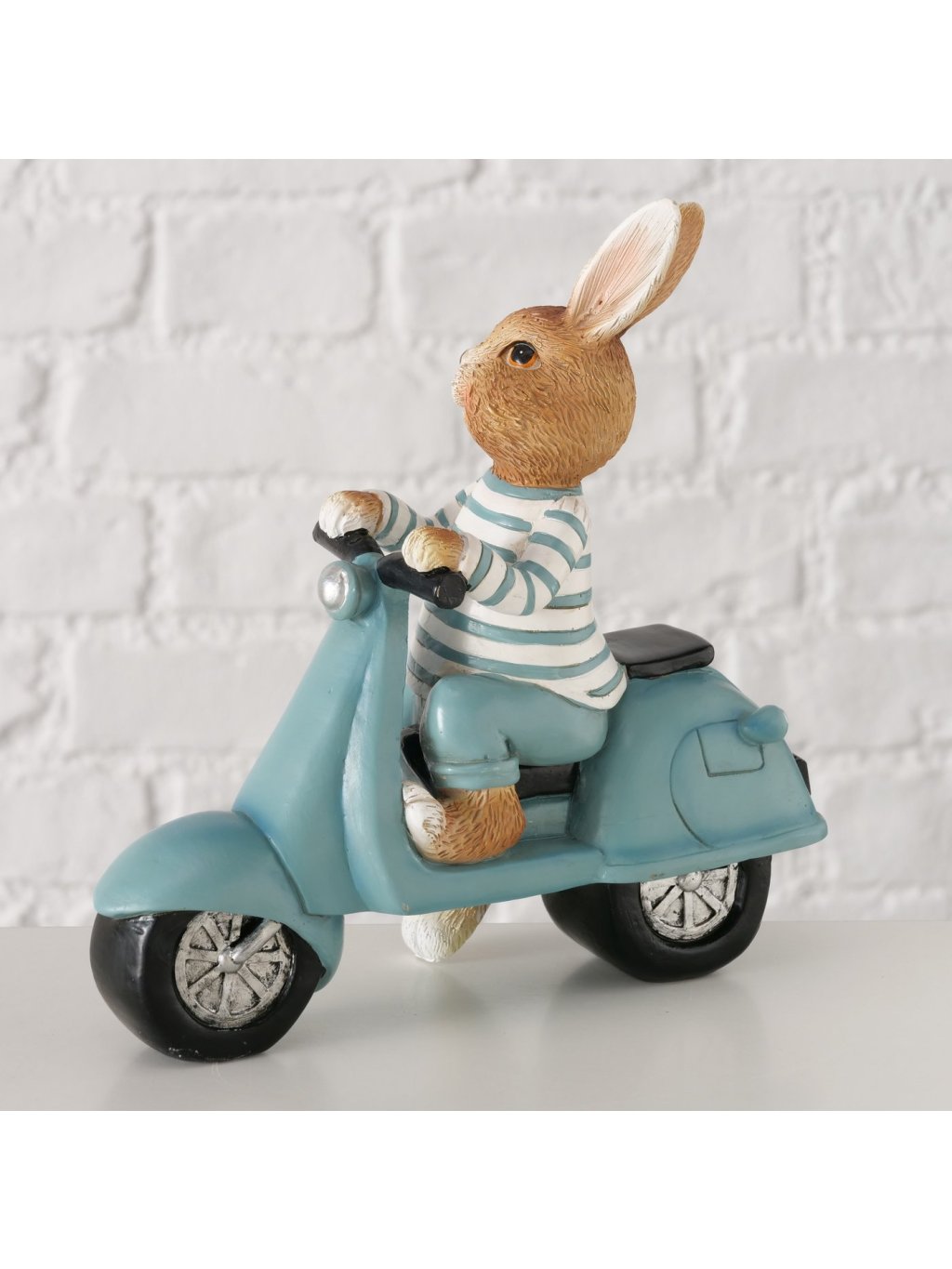 Zajac Jonas v pruhovanom tričku, sediaci na motorke v jemnom modrom odtieni, je dekorácia, ktorá okamžite zaujme. Pôsobí hravo, trochu retro a veľmi sympaticky – ako malý jarný príbeh zachytený v jednom momente.