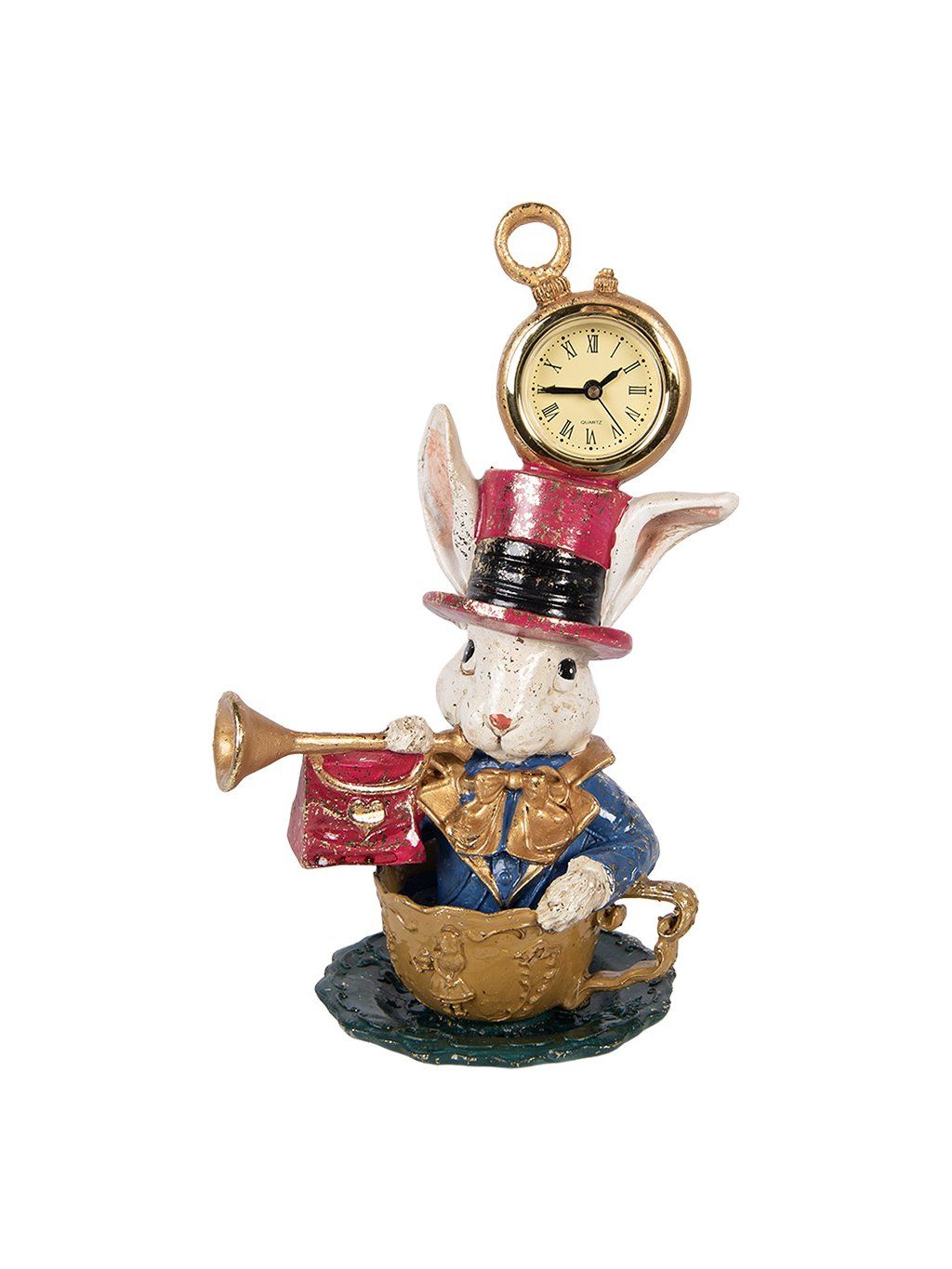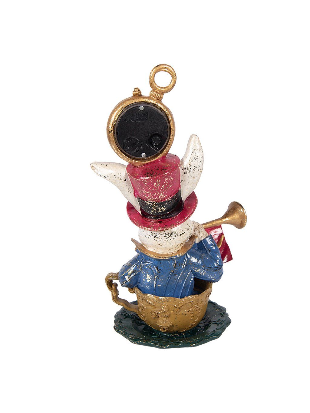 Táto výrazná dekorácia s výškou 23cm spája estetiku s funkčnosťou. Zabudované hodinky dodávajú figúrke praktický rozmer, zatiaľ čo bohato zdobené detaily – zlatá šálka, elegantný oblek a jemná patina – vytvárajú dojem nostalgického šarmu. Farebná kombinácia béžovej, zlatej, modrej a vínovej pôsobí teplo a štýlovo, takže sa hodí do klasického aj eklektického interiéru.