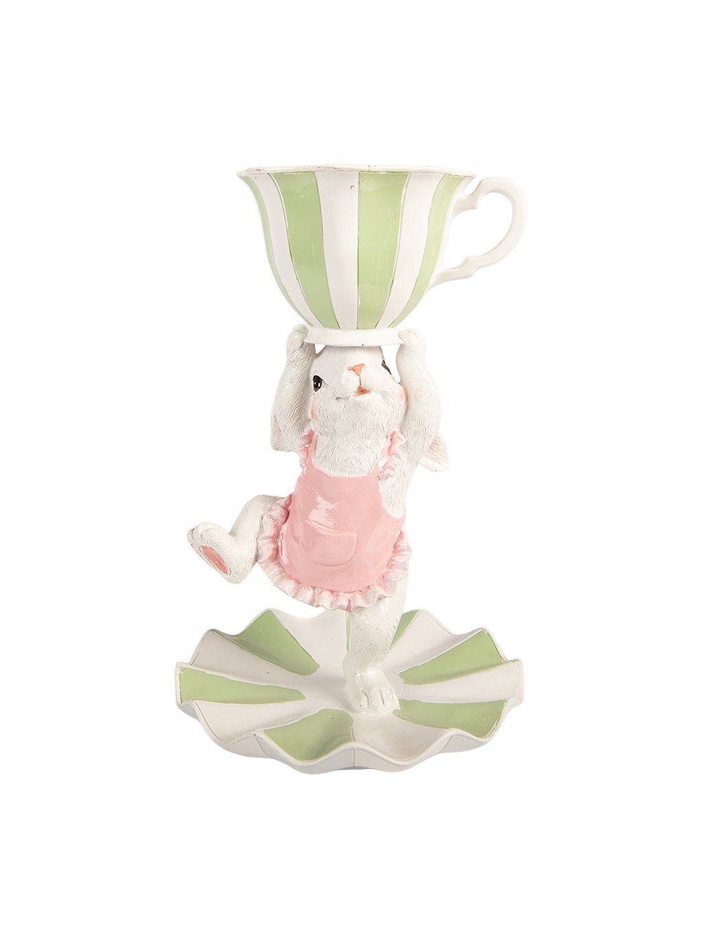 S výškou 24cm je ideálnym doplnkom veľkonočný stôl. Svieža kombinácia bielej, jemnej ružovej a pastelovej zelenej pôsobí ľahko a romanticky. Horná šálka spolu so spodnou miskou vytvárajú praktický priestor na drobné vajíčka, sladkosti či malú sviečku. Figúrka tak nie je len dekoráciou, ale aj milým funkčným prvkom, ktorý si môžete prispôsobiť podľa sezóny.