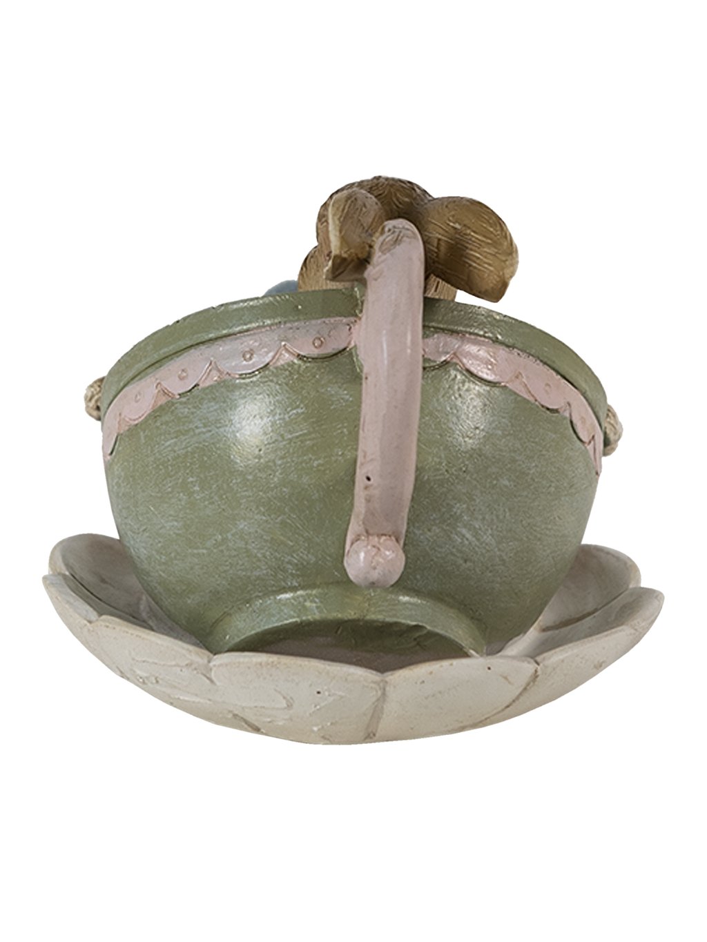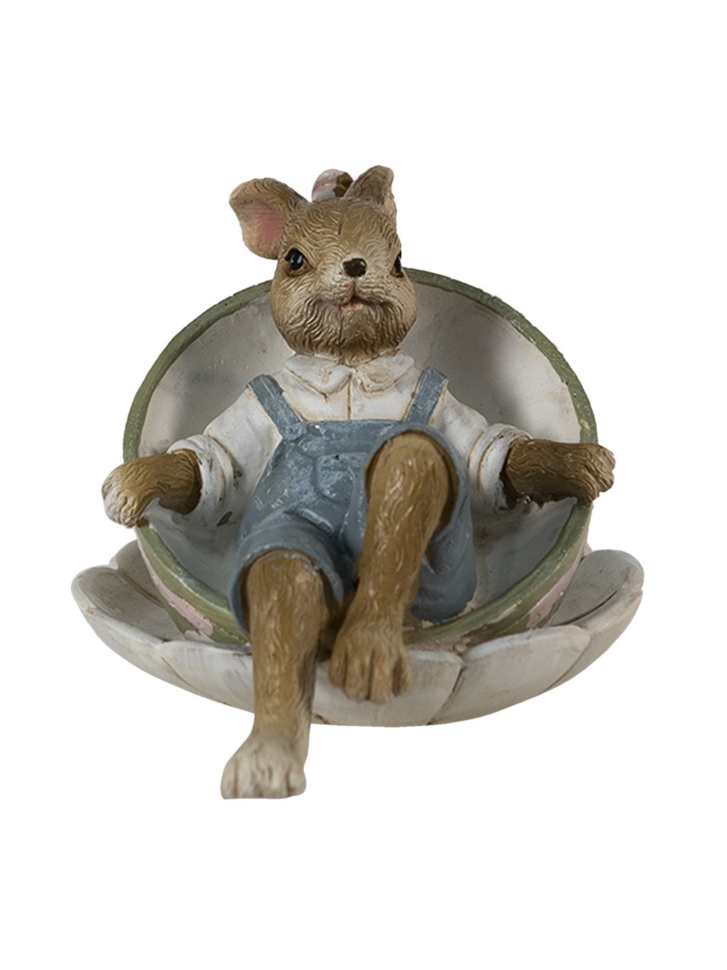 Kompaktné rozmery 11 × 7 cm z neho robia ideálnu ozdobu na poličku, podnos či sviatočný stôl. Jemná kombinácia zelenej, ružovej a prírodných tónov vytvára harmonický jarný akcent, ktorý zapadne do romantického aj rustikálneho interiéru. Figúrka je vyrobená z odolného polyresinu, čo zaručuje pevnosť, dlhú životnosť a krásne prepracované detaily. Hoci je ako stvorená na Veľkú noc, svojím milým výrazom vám bude robiť radosť pokojne po celý rok.