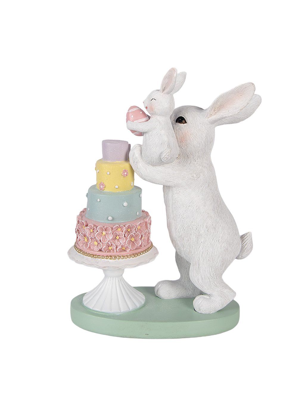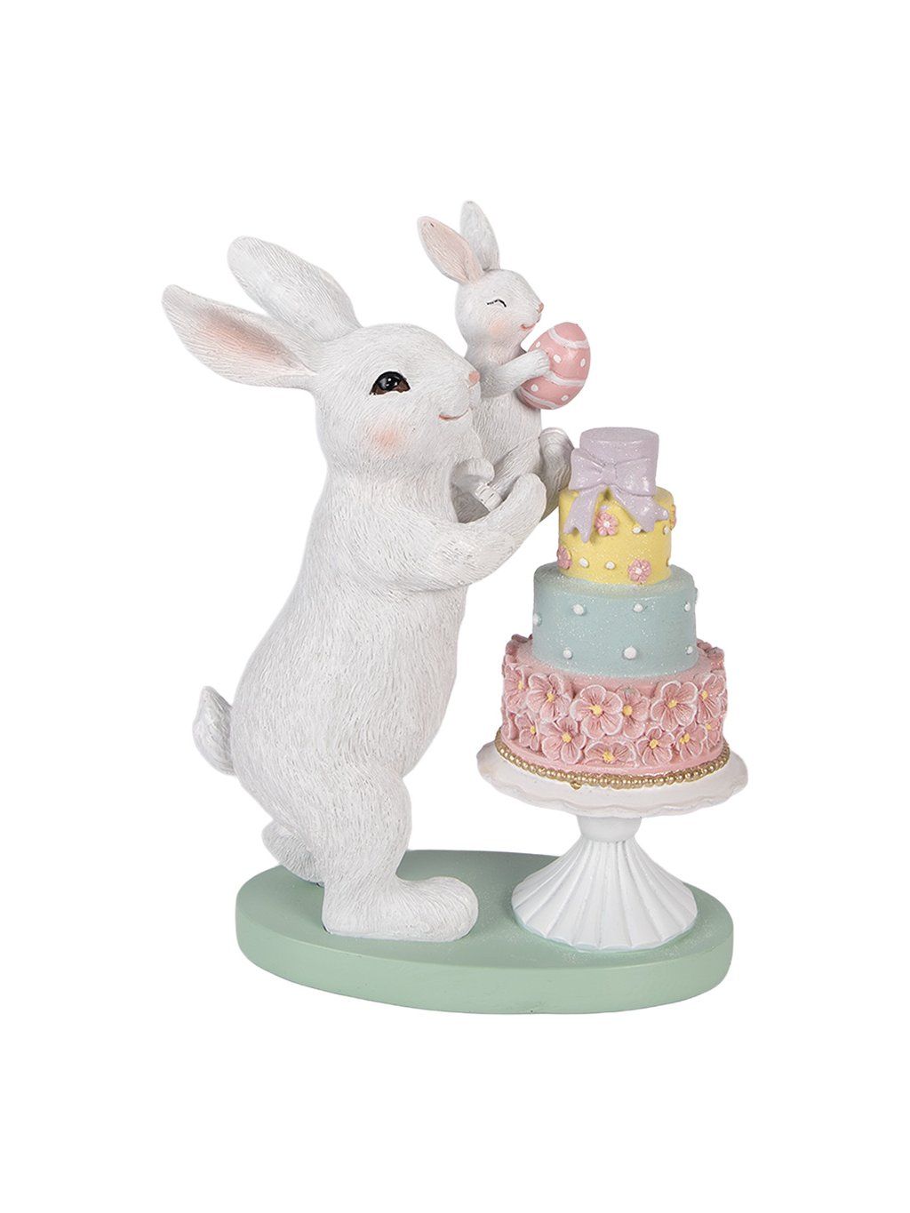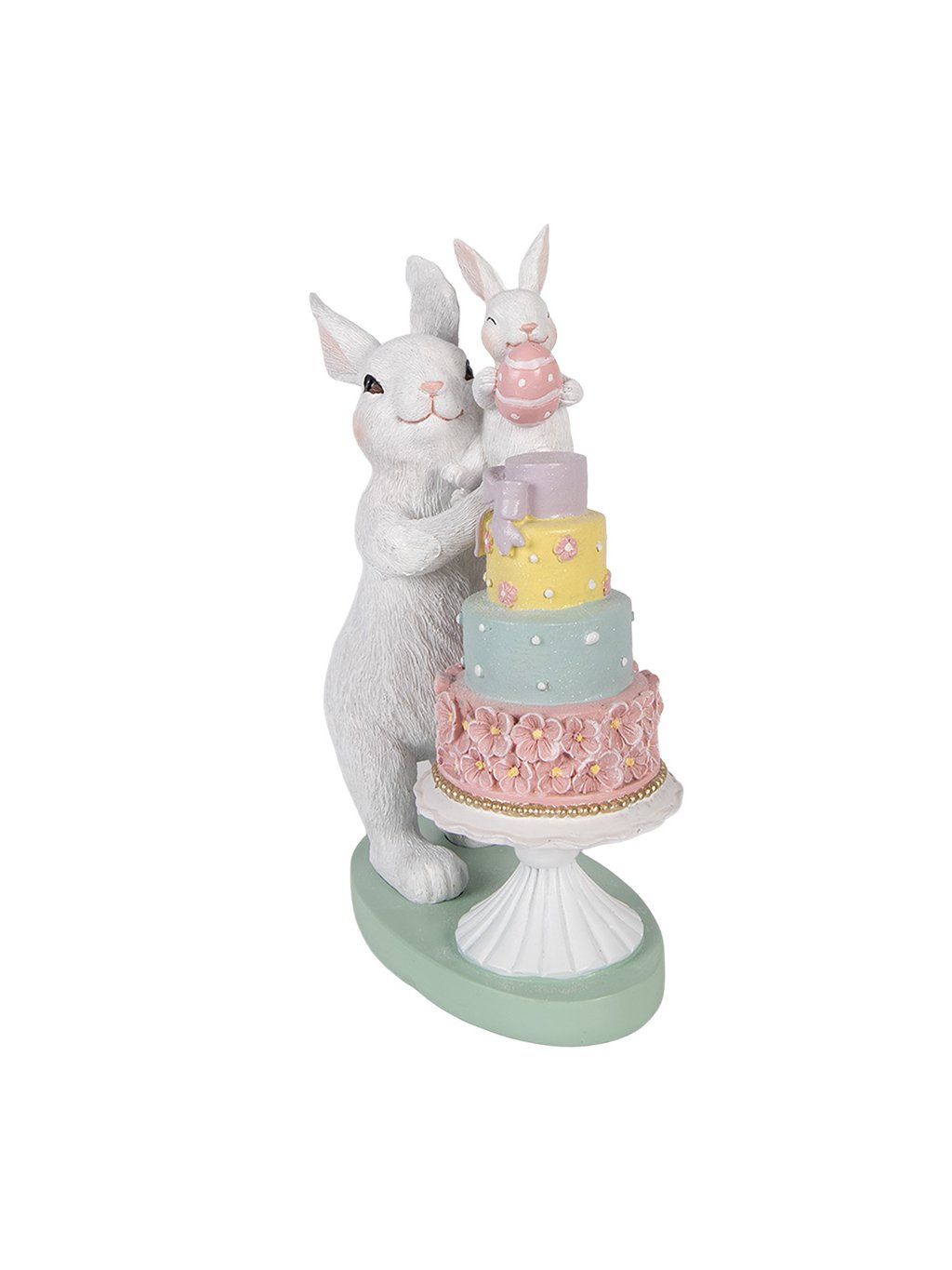 S rozmerom 21 × 10 × 27 cm ide o výraznejší dekoračný kúsok, ktorý si prirodzene získa pozornosť. Jemná biela farba zajkov v kombinácii s pastelovou tortou v ružovej, mentolovej a žltej vytvára harmonický, veselý akcent. Detailné spracovanie – od štruktúry srsti až po drobné kvietky na torte – dodáva figúrke autentický a precízny vzhľad.