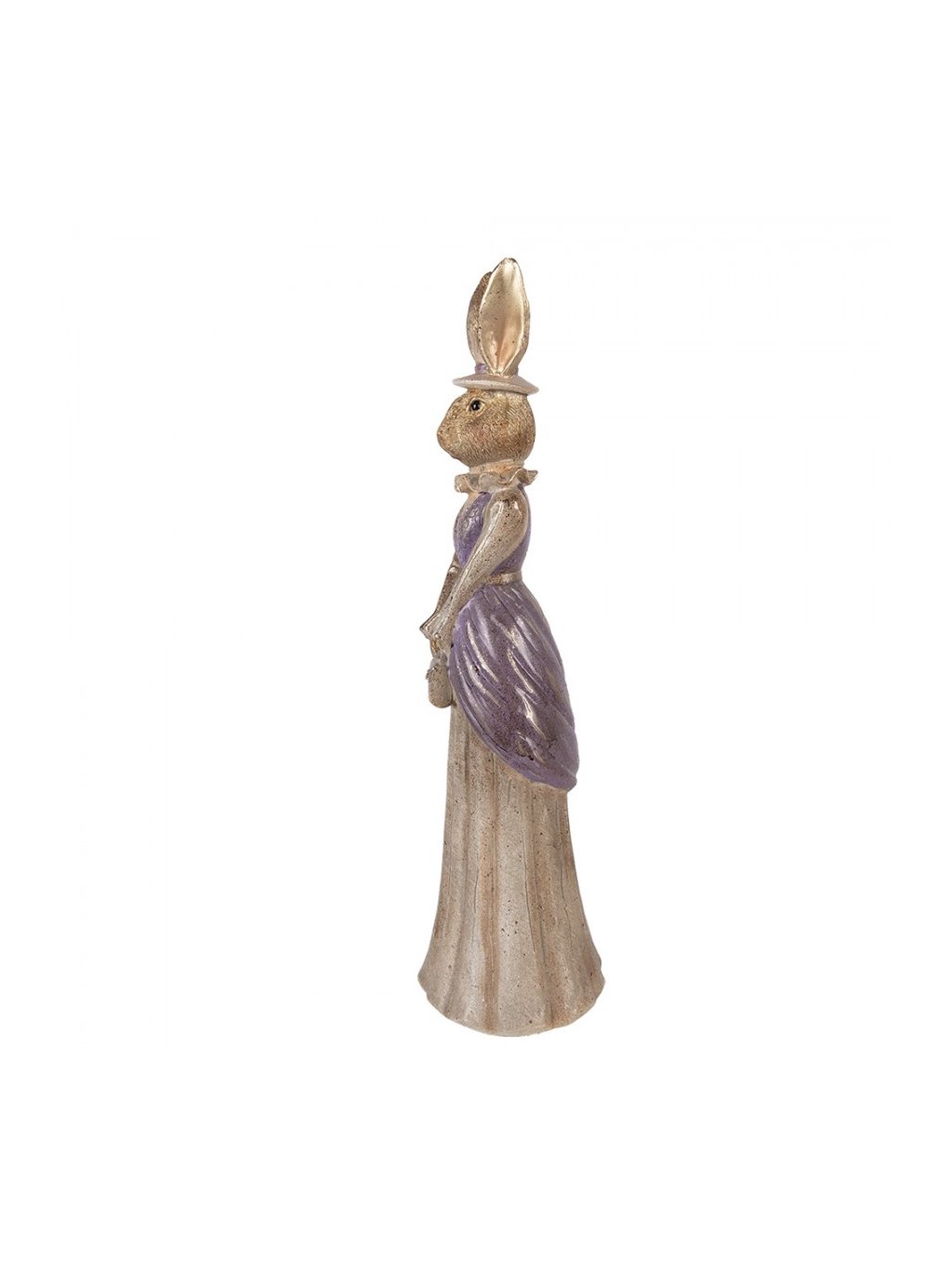 S výškou 48cm ide o výrazný solitér, ktorý krásne vynikne v priestore. Kombinácia zlatistých tónov s jemnou levanduľovou na šatách vytvára sofistikovaný, no stále hrejivý dojem. Dlhá splývavá sukňa, decentné volány pri krku a drobná kabelka v rukách podčiarkujú jej šarm a ženskosť.