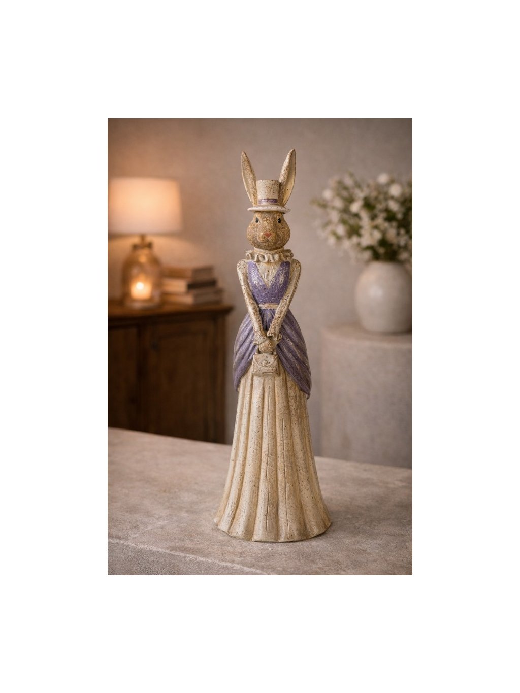 Elegantná dáma, ktorá si potrpí na detail. Táto vysoká zajačica s klobúčikom a kabelkou pôsobí nežne, no zároveň sebavedomo – ako dekorácia, ktorá dodá interiéru štýl aj jemnú hravosť.