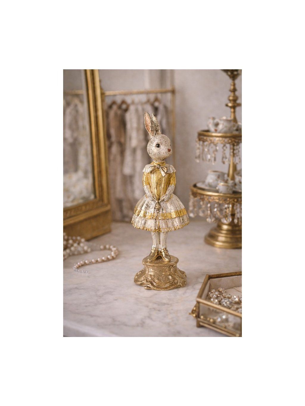 Jemná elegancia s nádychom nostalgie. Táto zajačica v bohato zdobených šatách pôsobí ako dáma z romantického salónu – tichá, upravená a s prirodzeným pôvabom. Je to dekorácia, ktorá okamžite dodá priestoru noblesu.