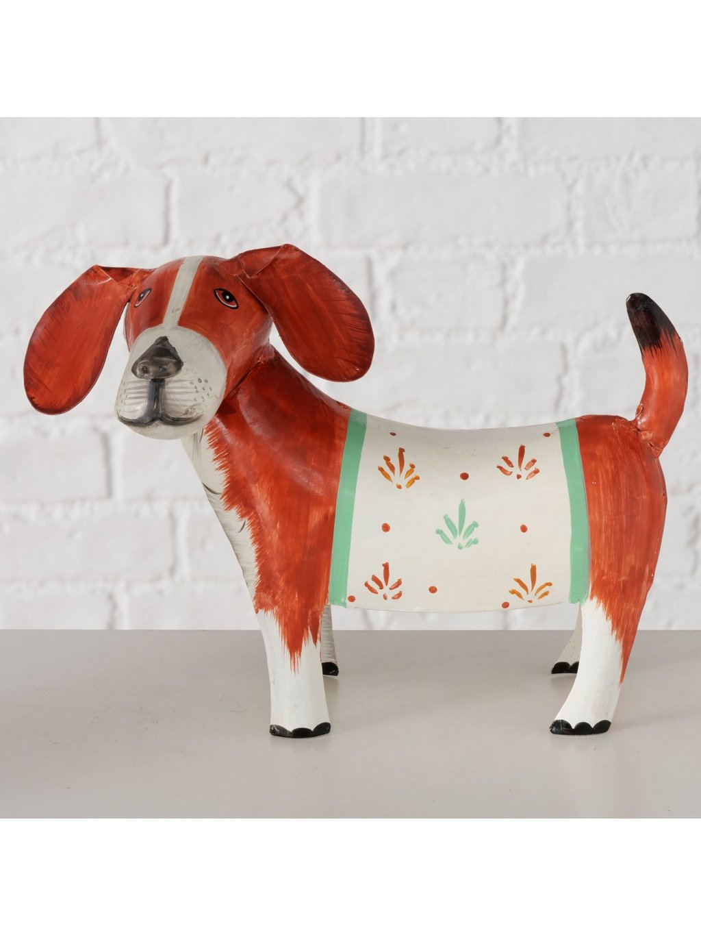 Tento ručne vyrábaný a ručne maľovaný kovový pes je vytvorený z lakovaného železa s jemným leskom. Kombinácia hnedých, krémových a zelených tónov spolu s drobným dekoratívnym vzorom pôsobí teplo a prirodzene. Každý kus má vlastné drobné odchýlky v maľbe – práve tie mu dávajú dušu a robia z Hubertyho originál.