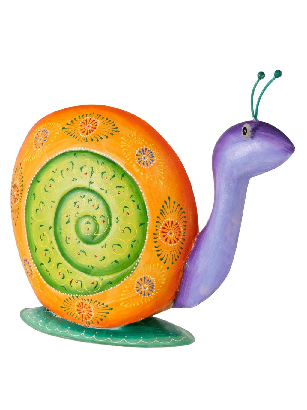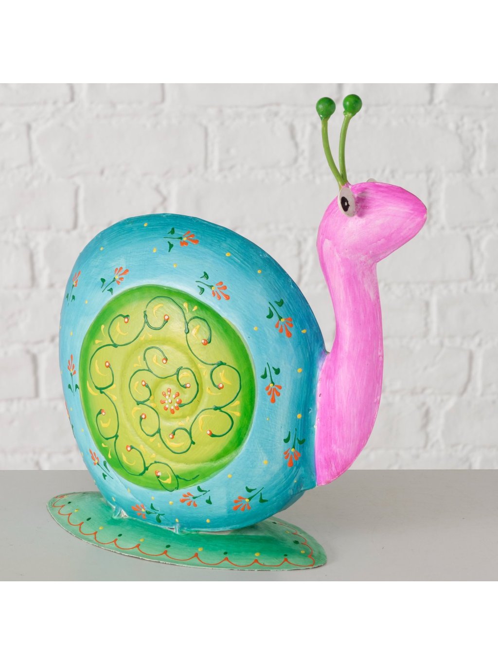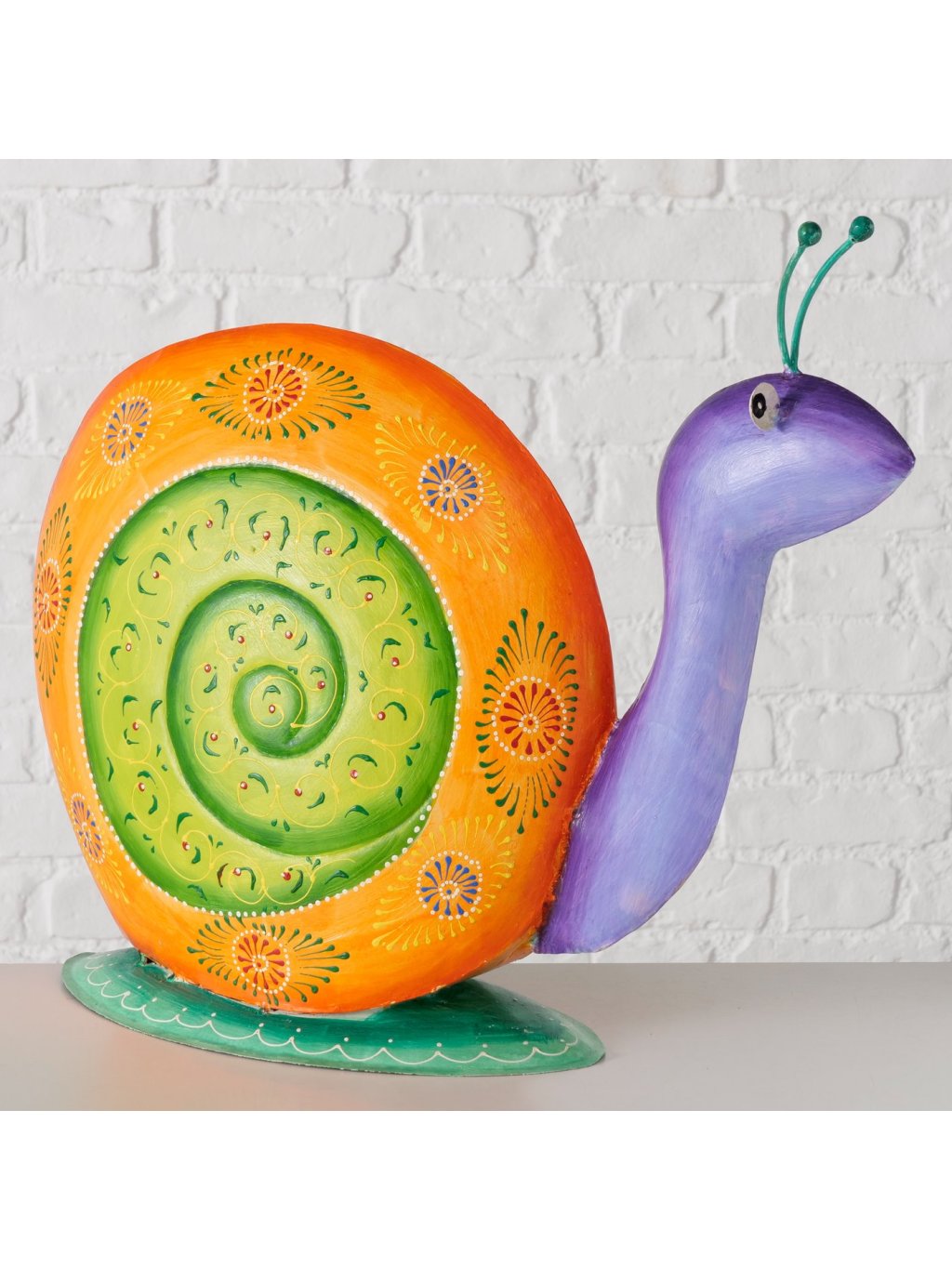 Tento ručne vyrábaný a ručne maľovaný kovový slimák je vyrobený z lakovaného železa s jemne lesklým povrchom. Každý kus je originál – zdobia ho bohaté farebné kombinácie, ornamentálne vzory a špirálovitá ulita, ktorá prirodzene priťahuje pohľad.