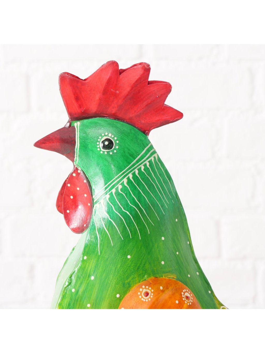 Tento jedinečný ručne maľovaný kohút v žiarivej kombinácii zelenej, oranžovej a červenej farby s lesklým povrchom predstavuje skutočné umelecké dielo, kde každý ťah štetca odráža zručnosť a kreativitu jeho tvorcu, vďaka čomu sa každý kus stáva neopakovateľným originálom plným charakteru a života. 🧡💚❤️