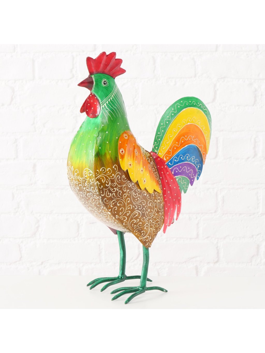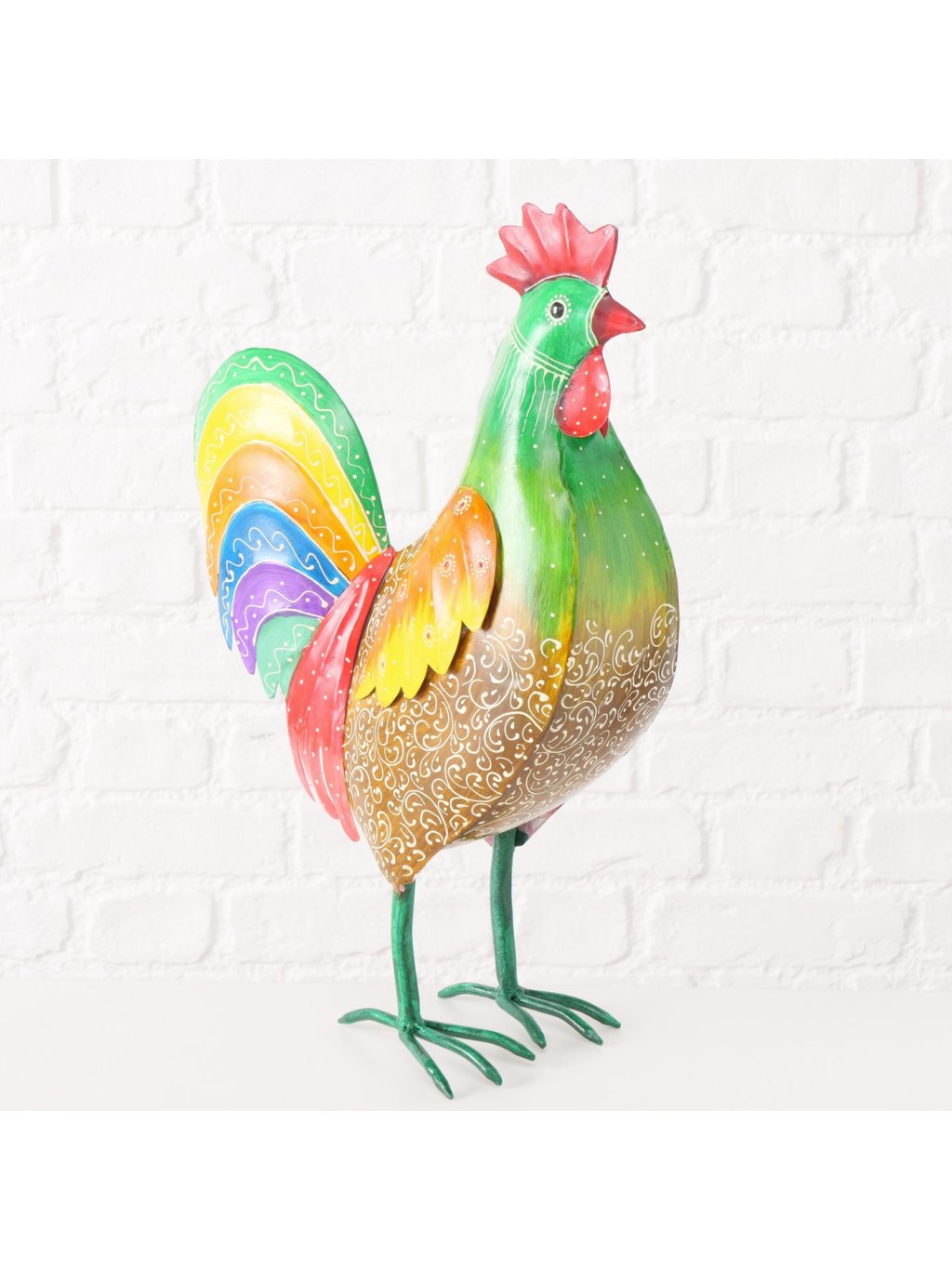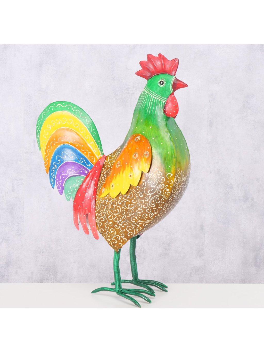 Vyrobený z kvalitného železného plechu a dosahujúci úctyhodnú výšku 51 cm, tento majestátny kohút s dĺžkou 34 cm a šírkou 15 cm je dokonalou ukážkou tradičného remesla v modernom šate, kde sa precízne ohýbanie kovu spája s umeleckou maľbou do harmonického celku, ktorý pôsobí súčasne rustikálne aj elegantne.