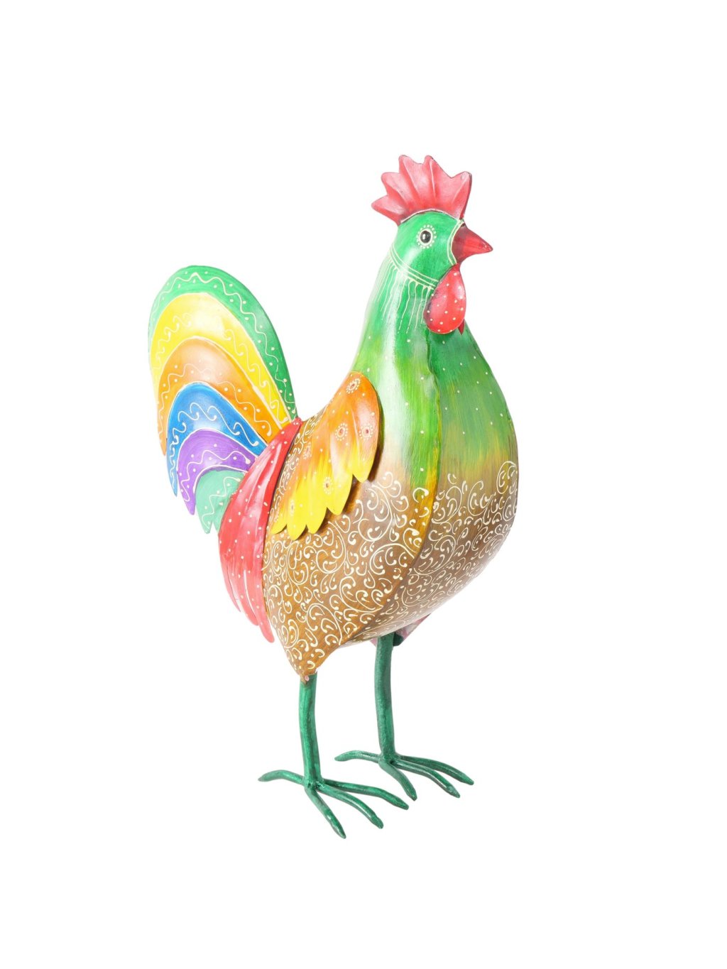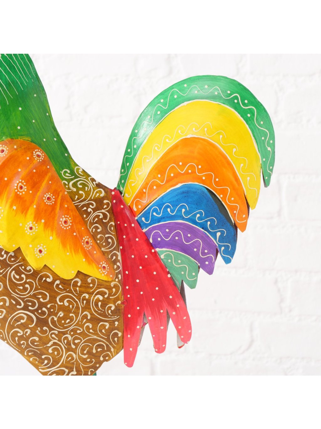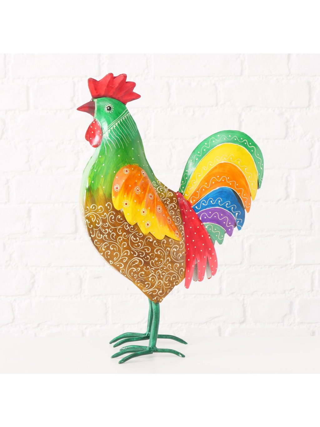 Vyrobený z kvalitného železného plechu a dosahujúci úctyhodnú výšku 51 cm, tento majestátny kohút s dĺžkou 34 cm a šírkou 15 cm je dokonalou ukážkou tradičného remesla v modernom šate, kde sa precízne ohýbanie kovu spája s umeleckou maľbou do harmonického celku, ktorý pôsobí súčasne rustikálne aj elegantne.