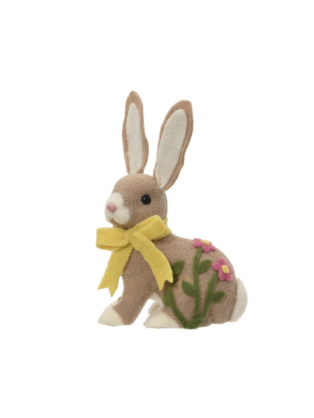 Zajačik je ručne vyrobený z mäkkej plsti v prirodzenom hnedom odtieni. Žltá mašľa okolo krku a drobné kvety s lístkami na boku mu dodávajú jemný farebný akcent, ktorý nepôsobí rušivo. Vďaka výške 30cm je dostatočne výrazný, no stále vhodný aj na menšie plochy – poličku, parapet či príručný stolík. Každý kus má mierne odlišné detaily, čo podčiarkuje jeho ručný charakter.